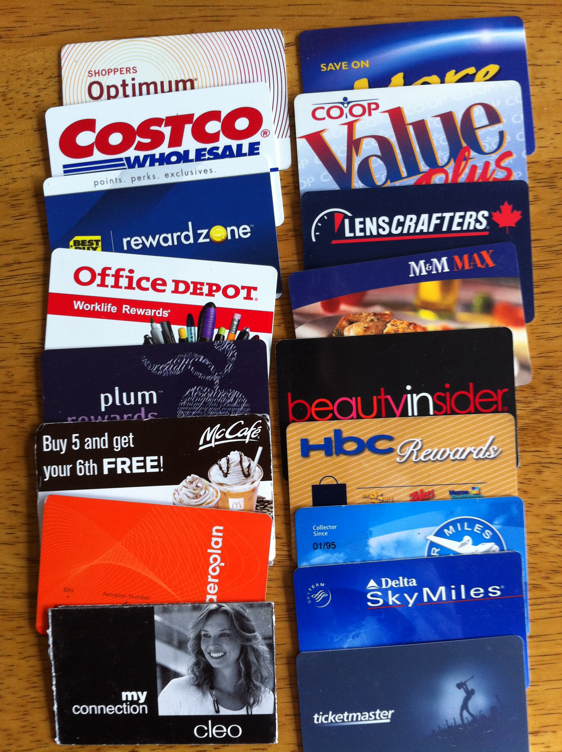 In addition to those I have cards for specific stores that I shop at fairly often but not all the time. There are fourteen of those at the moment, as well as three airline “miles” cards that never actually buy me any air miles. I thought I could leave them at home and make a point of taking them with me when I went to those stores, but that was a miserable failure. It turns out I don’t always know when I’m going to be shopping at any of them, and the need for them only occurs once I’m out and about. I think “Oh, while I’m in this neighbourhood I’ll just drop in at Store X and get Y,” and I don’t think about the card until I’m actually at the cash register.
