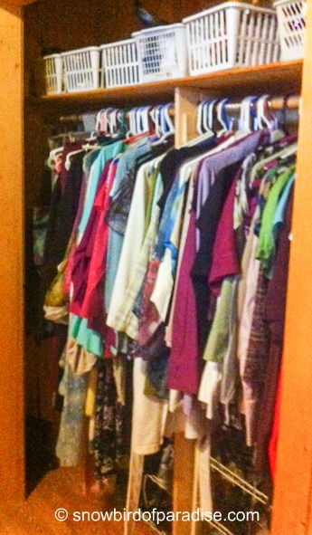 She and I were sitting on my couch and trying to come up with a plan to reinvent the two closets in my apartment to try to make better use of the space.  At present, both closets are the old style with a simple rod across the space with a shelf on top. They also have spaces in the “wings” where clothes go to die. The special-occasion dresses hide out there in the dark recesses until they no longer fit. Eventually they get taken to the thrift store, but their first stop is the wings of the closet.