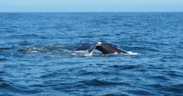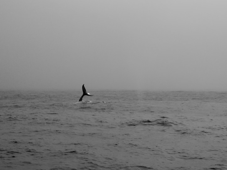 Yesterday, my niece and I took a four-hour whale watching trip and were fortunate enough to see lots of humpback whales and one killer whale. When the day began it was foggy but the sky cleared after about an hour. When I first saw the earliest photos I thought I had accidentally shot them in black and white, but I had not. Those shots show how the fog affects perceptions of colour, and I was able to get a great picture of a fishing boat leaving the harbour. I also feel fortunate to have got one good shot of a tail flip before one whale went back into the water, a couple of waterspouts, and the dorsal fin of the Orca. All in all, it was a fabulous day.