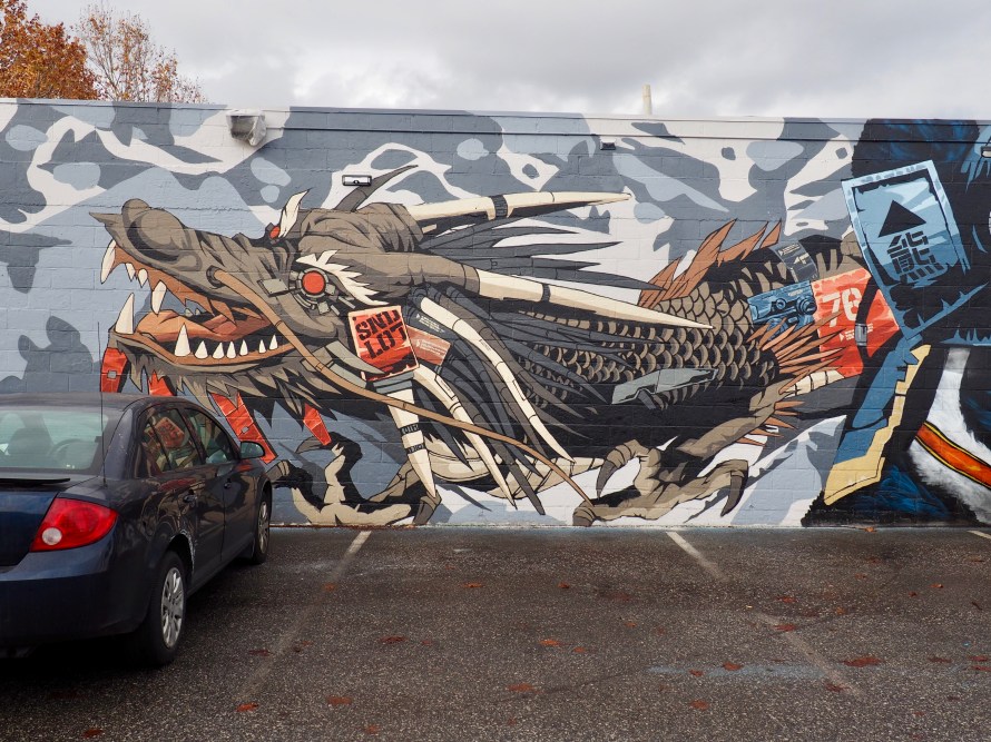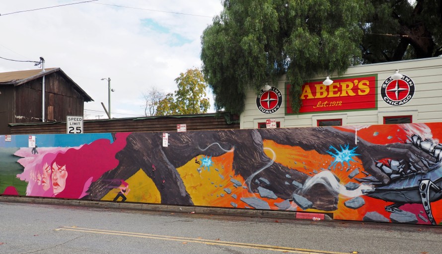 The old bicycle store that caught fire a few years ago is still under renovation, but it is now surrounded by a plywood wall covered in a mural telling the story of a King Kong-type cyclops, a damsel in distress, and aliens. (Murals by @ROANVICTOR and @SEANBOYLES38TH)
