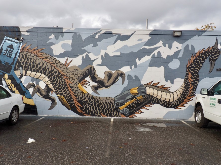 In the same back alley, behind the dog daycare, is a mural of various kinds of dog. I don’t think many people use this alley, so these are some secret delights for walkers such as myself. (Murals by Ivan T. Gonzales @ITG3000)