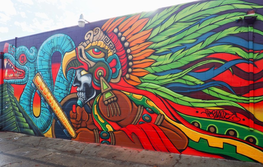 A store that formerly was a grocery store now sells kitchen appliances, and their parking lot mural at the side of the building has changed, too. Now it has a dragon and much darker tones. In their back alley, the building has a very colourful mural that looks as if it has Aztec influence, and a blue dragon. (Blue Dragon mural by Hernandez. Other mural artists not known.)