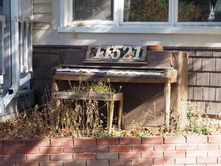 Piano and stool in a front yard