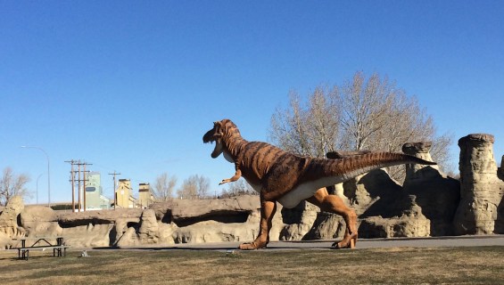 Dinosaur, Hoodoos, and grain elevators. Milk River Visitor Information Centre.