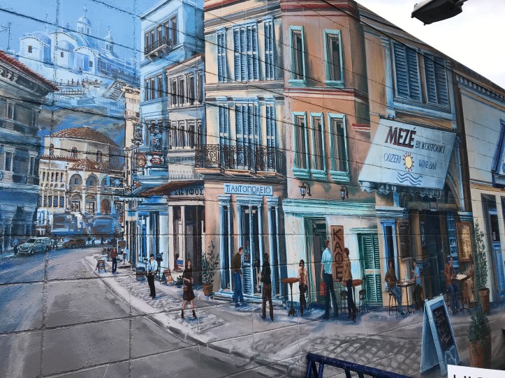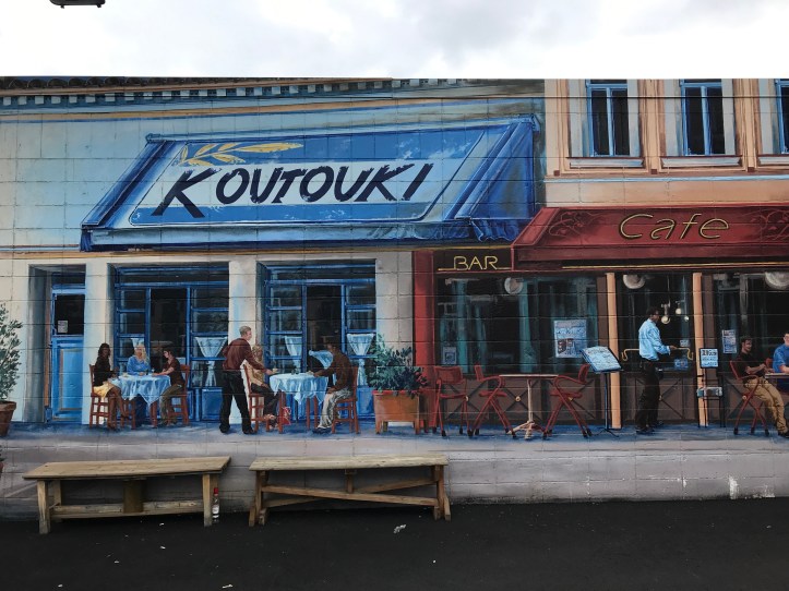The mural with the street scene and cafe is huge! It must have taken ages to paint it. I wonder where the artist got the idea for the snake among the strawberries.