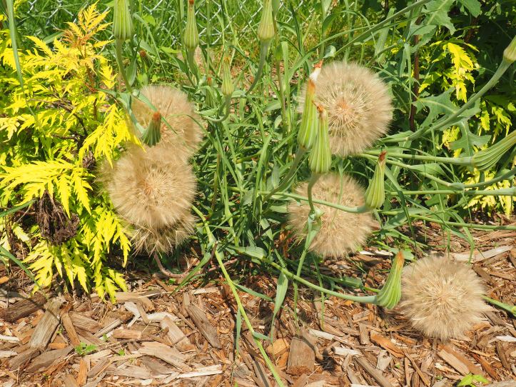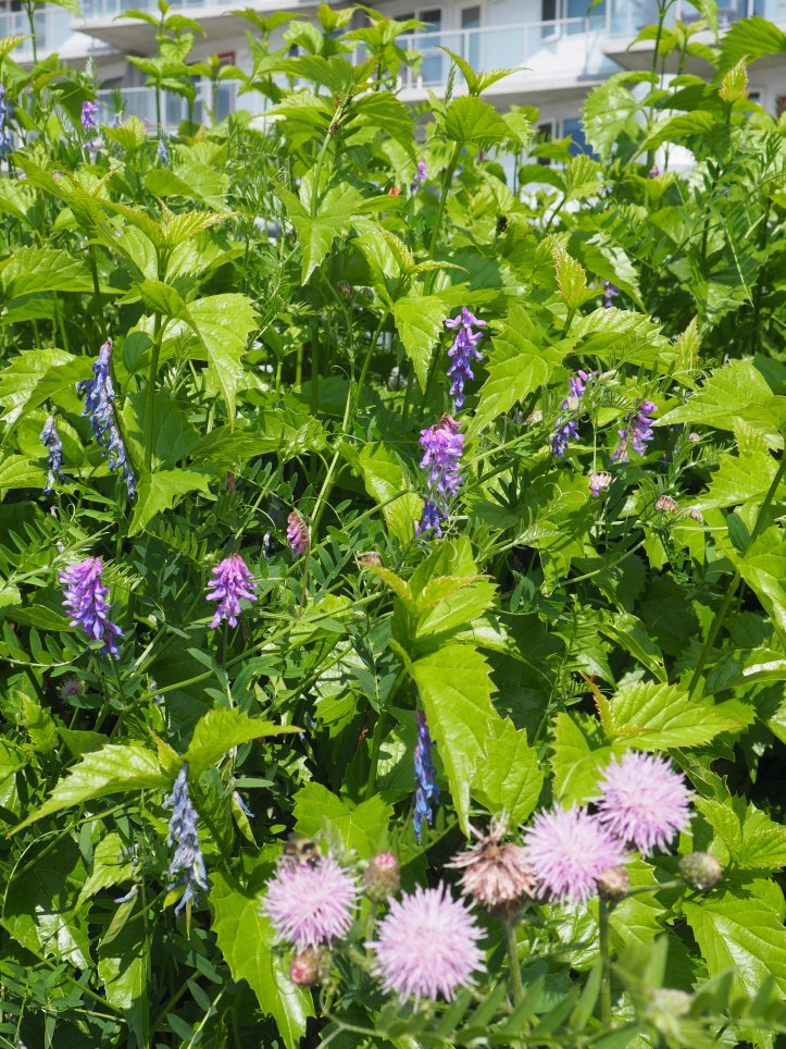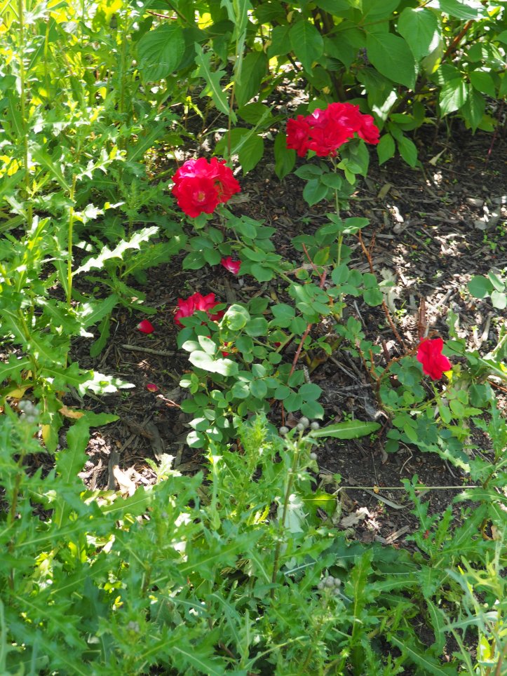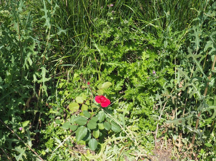 Yesterday, it was delightfully sunny and when I went for a walk I noticed, along the path by the LRT tracks, that the weeds have almost overtaken the planted shrubs. There were literally roses among thorns; well, thistles anyway. Here are some of the plants I saw.