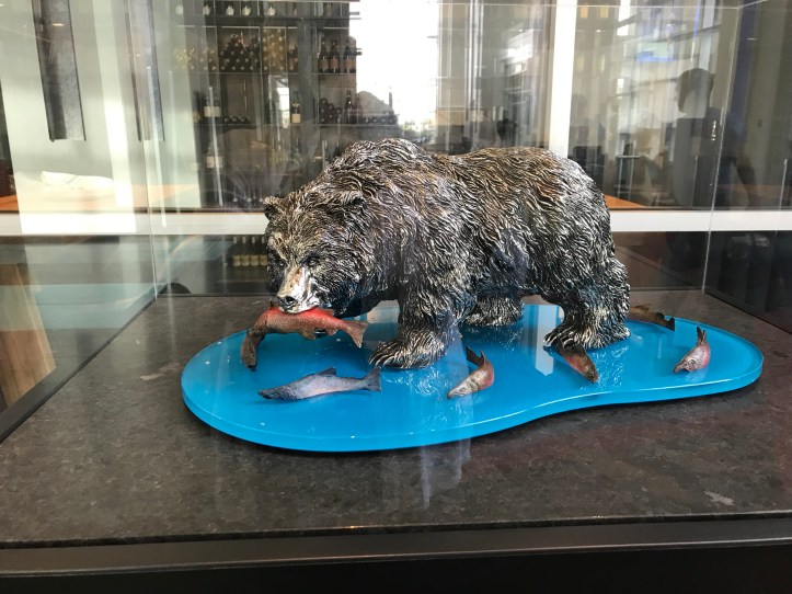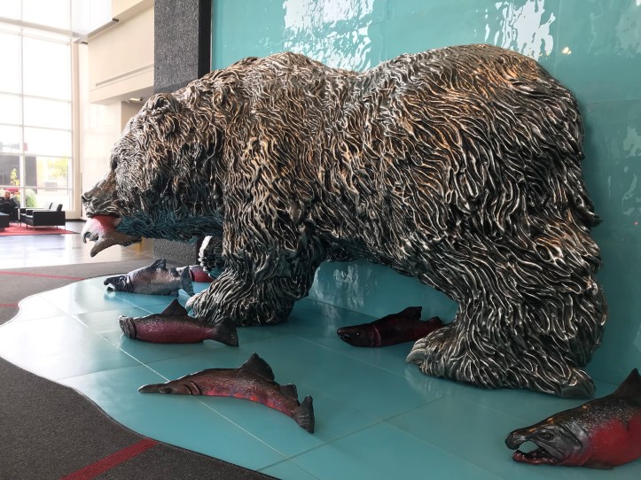 The Epcor Tower on 101 Street has a magnificent foyer and in that foyer are several pieces of art. As soon as you walk through the main doors you are confronted with a huge, 7,200 lbs sculpture of a grizzly bear eating salmon. It is quite splendid.