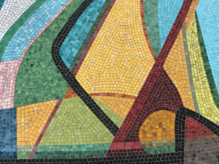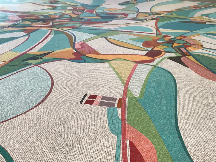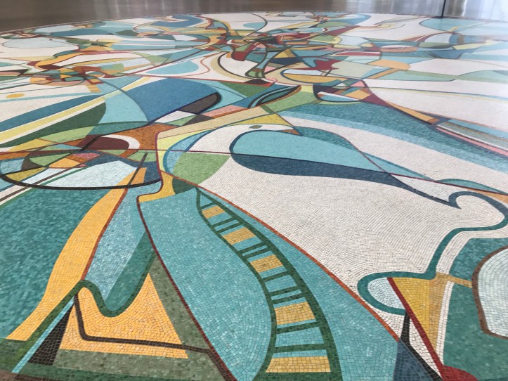 Then we saw the huge floor mosaic by looking down on it from an upper balcony. Today we saw it by actually walking on and around it. Its imagery is representative of the city of Edmonton and includes the river, the roads, and snow. We tried to pick out some of those things, but mostly we just enjoyed its bold colours and design.