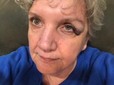 After I got home I felt incapable of bending or lifting anything, and I was very tired. I put ice on my eye, took a nap on the couch, and in the evening I asked my family to help me to get supper. With their TLC and the help of some ibuprofen, I managed to get a fairly decent night’s sleep and when I woke the next morning I realized that the bruising around my eye had migrated and changed colour.