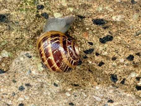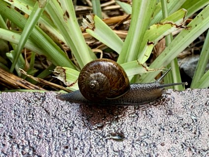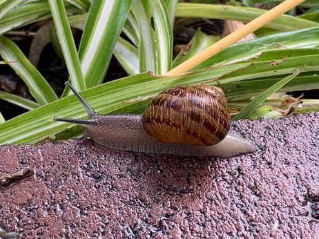Among the many things they eat are snails, and so it would make sense to conclude that they are the reason that my patio snails disappeared. Today, however, I saw three snails! It has been raining all day and these three snails surfaced. I was pleased to see that some have survived, but I hope the possums didn’t see them. I’d like to keep a few around as my own garden pets.