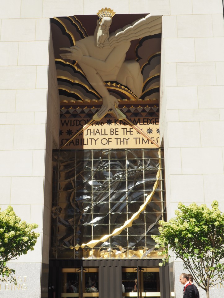 The main entrance is massive and incorporates the Art Deco carved rendering of Wisdom, created by Lee Lawrie. Wisdom is flanked by Sound on the left and Light on the right. The inscription reads “Wisdom and Knowledge Shall Be The Stability of Thy Times.” It is a biblical reference, taken from Isaiah 33:6.