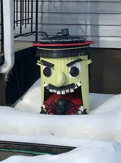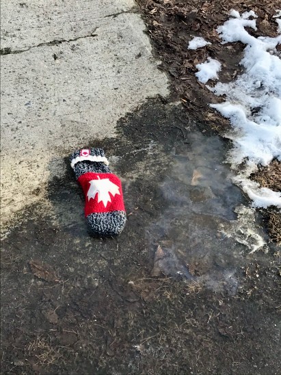 When not looking at my feet and trying to avoid ice today, I saw some sights that made me smile including some balloons, a snowman with an icicle crown, a garbage can eating a spider, and a very Canadian mitten.