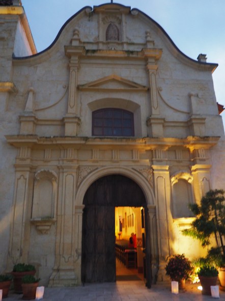 It was early evening and the light from inside the chapel was warm and welcoming. The exterior of the building was also illuminated and created some dramatic contrasts of light and shadow.