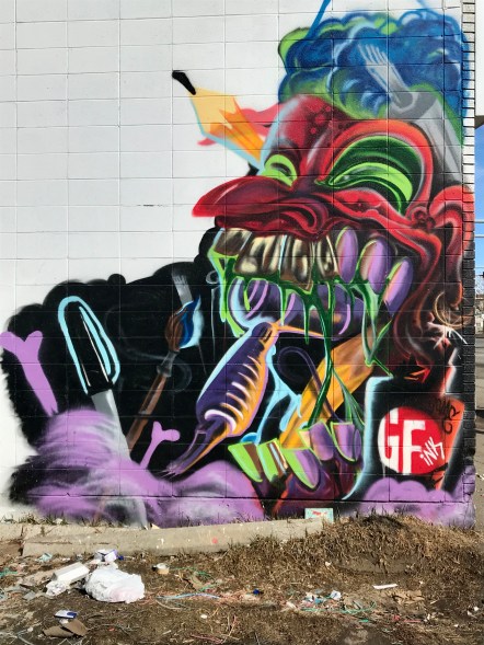 A few days ago, I came across a couple of murals behind a strip mall. One of the businesses in that mall is a tattoo shop called Goodfellas Ink and this first mural references them in the signature GFInk. Perhaps one of the tattooists created the mural; I don’t know. Regardless, it is a fascinating image and I have spent quite a bit of time looking at it and wondering about it.