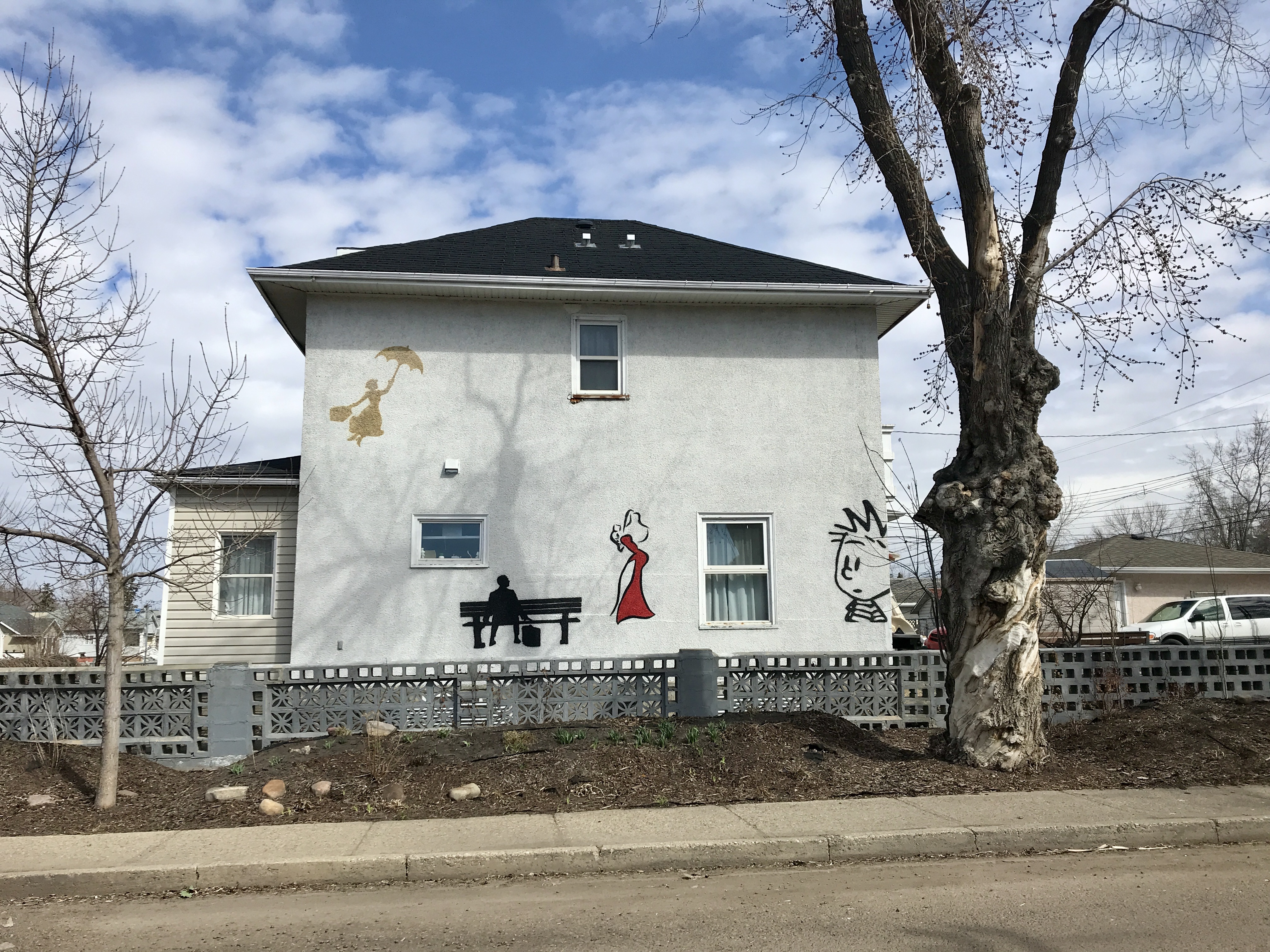 In my neighbourhood, there is a house with images painted on one of the side walls. All of the images are derived from popular culture and all have been carefully drawn and painted. At the top is Mary Poppins flying away with her umbrella. At the bottom is Forrest Gump sitting on his bench. To the right is Calvin from Calvin and Hobbes. Between Forrest Gump and Calvin is what appears to be an unfinished painting of Jessica Rabbit.