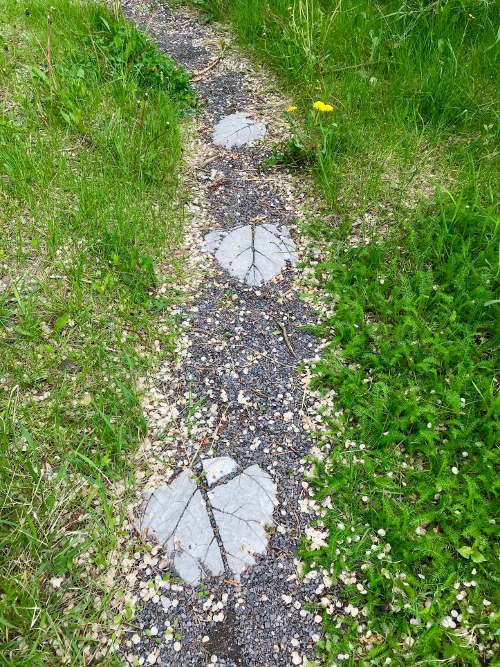 Leading away from the stone circle is a path which turns back on itself and returns to the stones. Embedded in the path are some stepping stones which are leaves cast in concrete. Someone went to a great deal of time and trouble to create those stepping stones and to design the path. I like to think that it is a short meditative detour. Or, perhaps there are fairies at the bottom of the garden. Who knows?