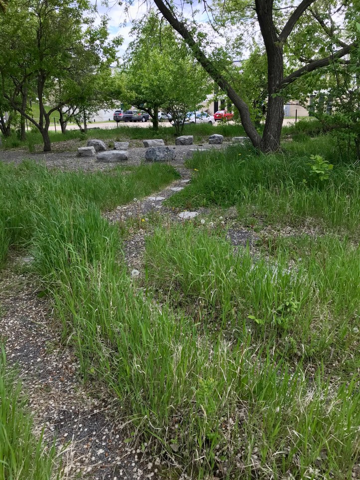 The grounds beside the Learning Disabilities Association building are at 106 Street and 45A Avenue. Within those grounds is a lovely area of trees, and among the trees is a circle of stones which are perfectly placed for a meeting, a picnic, or a campfire.