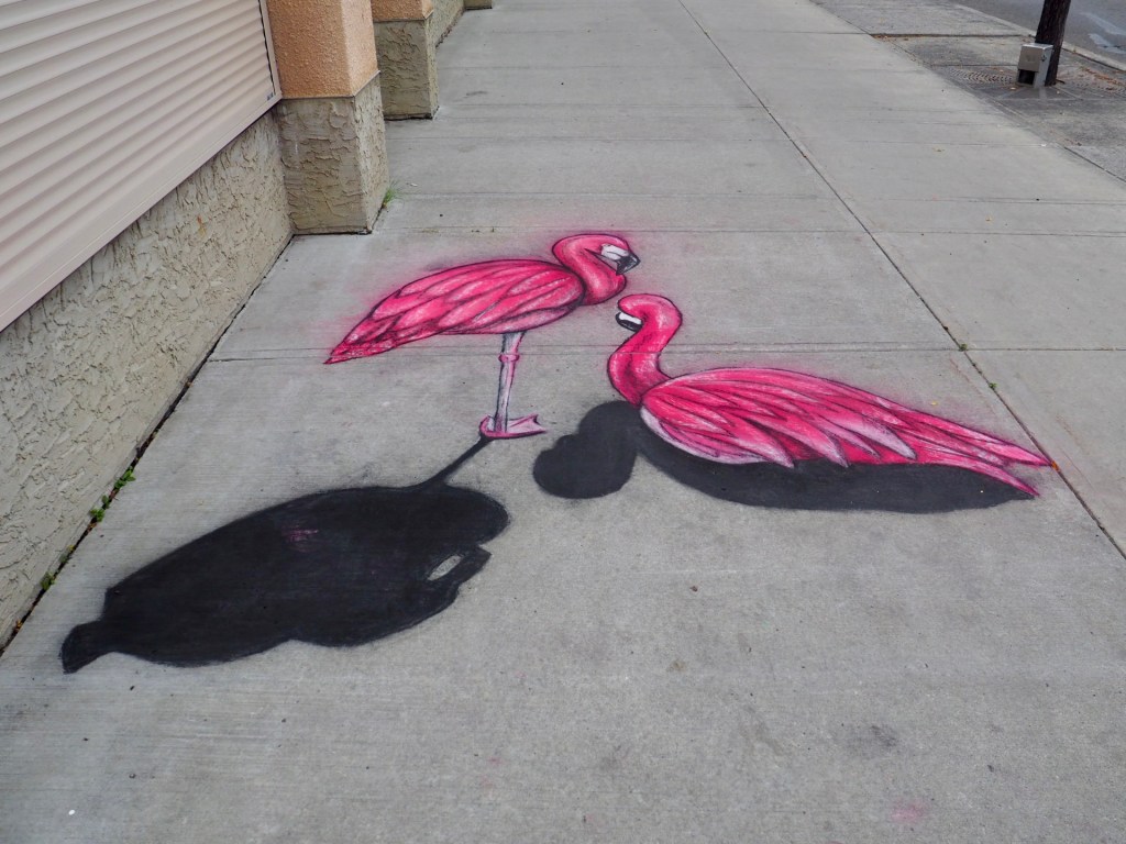 Just about a couple of blocks away I saw another product from Arts on the Ave. It is a chalk drawing of flamingos and the artist even provided a spot on the sidewalk for picture-taking. I dutifully stood on the star to take a picture.