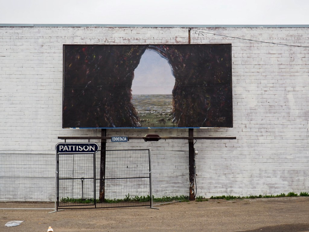 I have just discovered that the painting on the billboard was inspired by the Lovers’ Arch rock formation in New Brunswick, Canada. It is part of the Hopewell Rocks on the Bay of Fundy. I am thankful to the blog 100 Country Trek for revealing this to me.