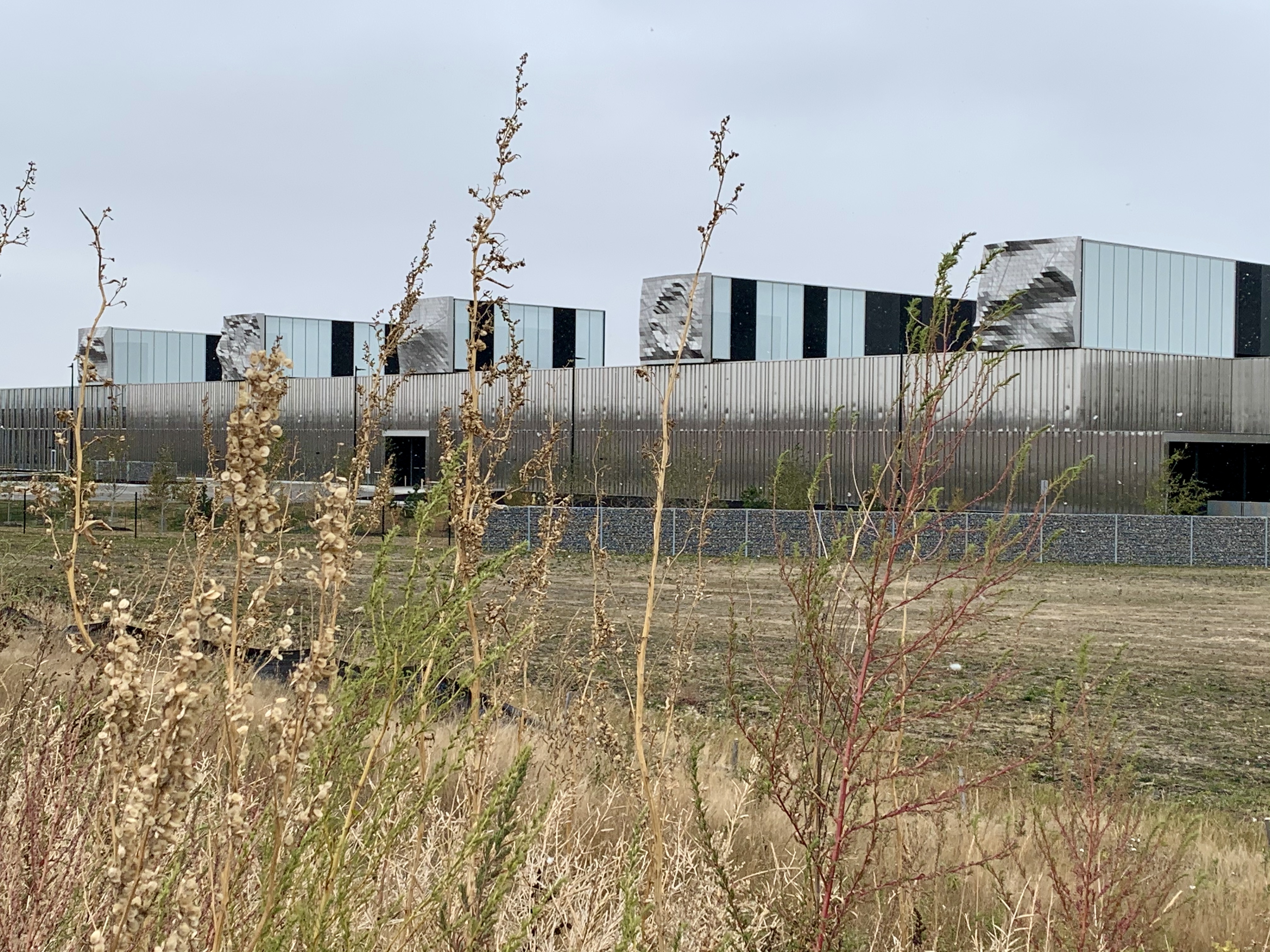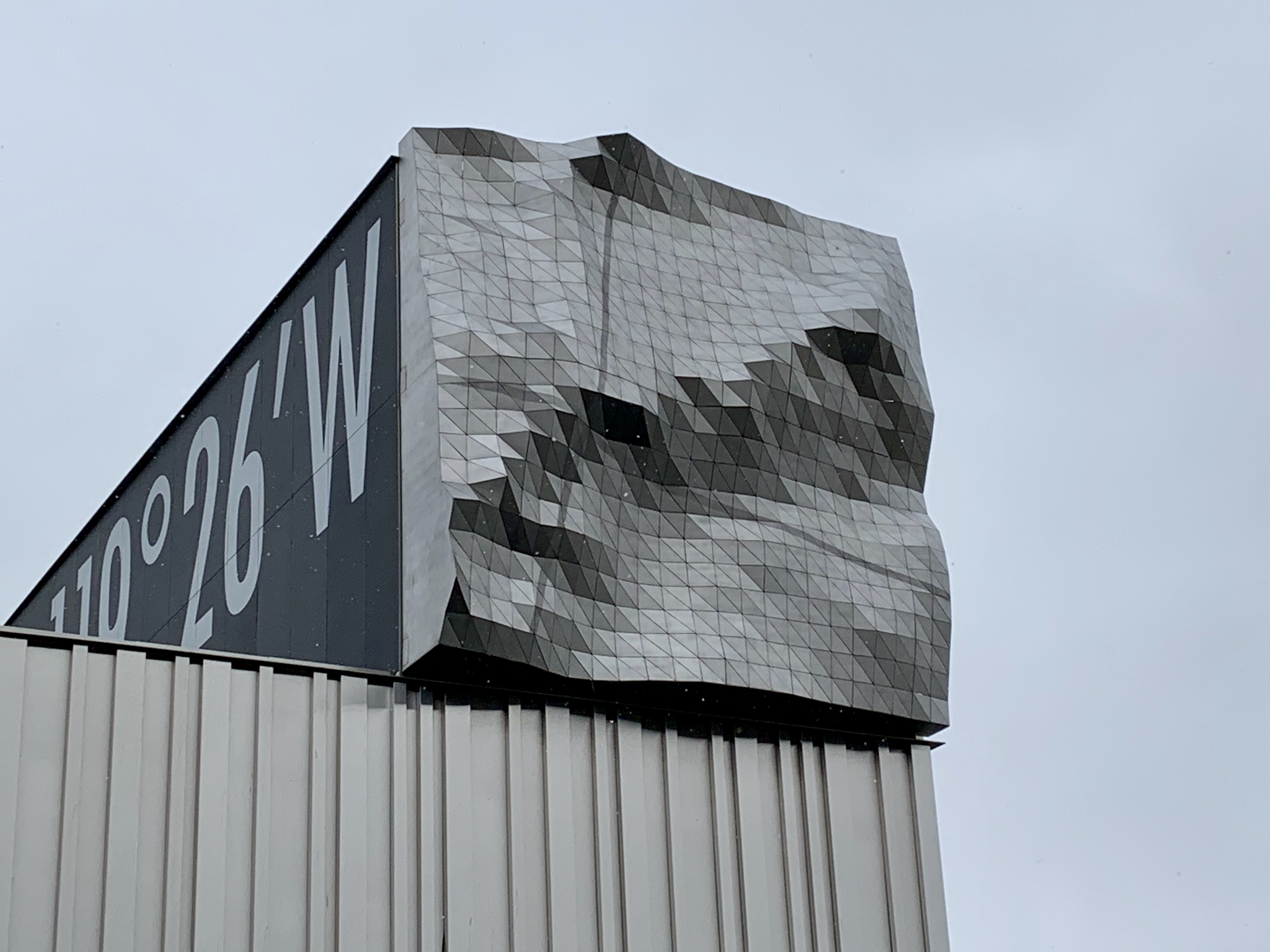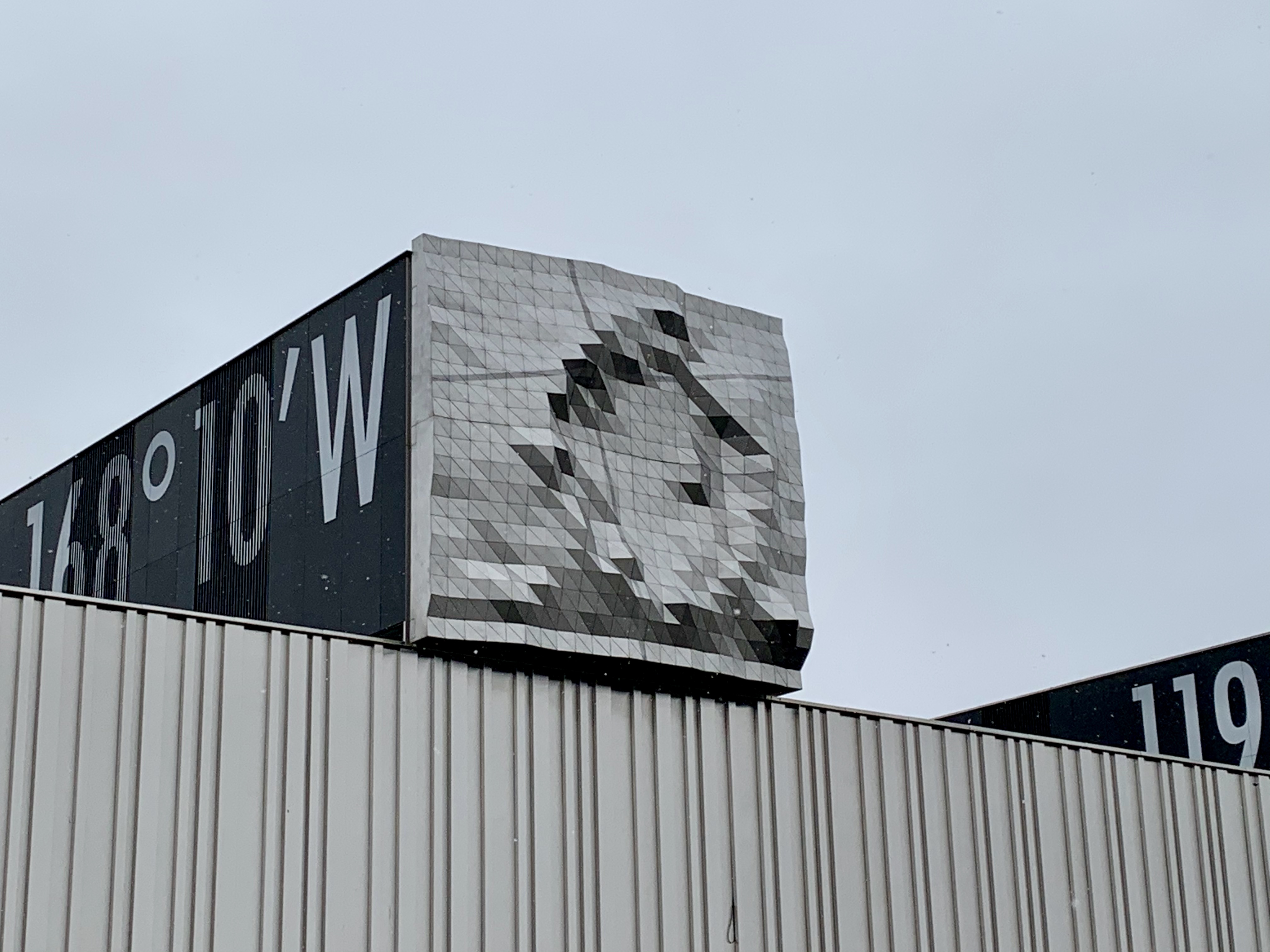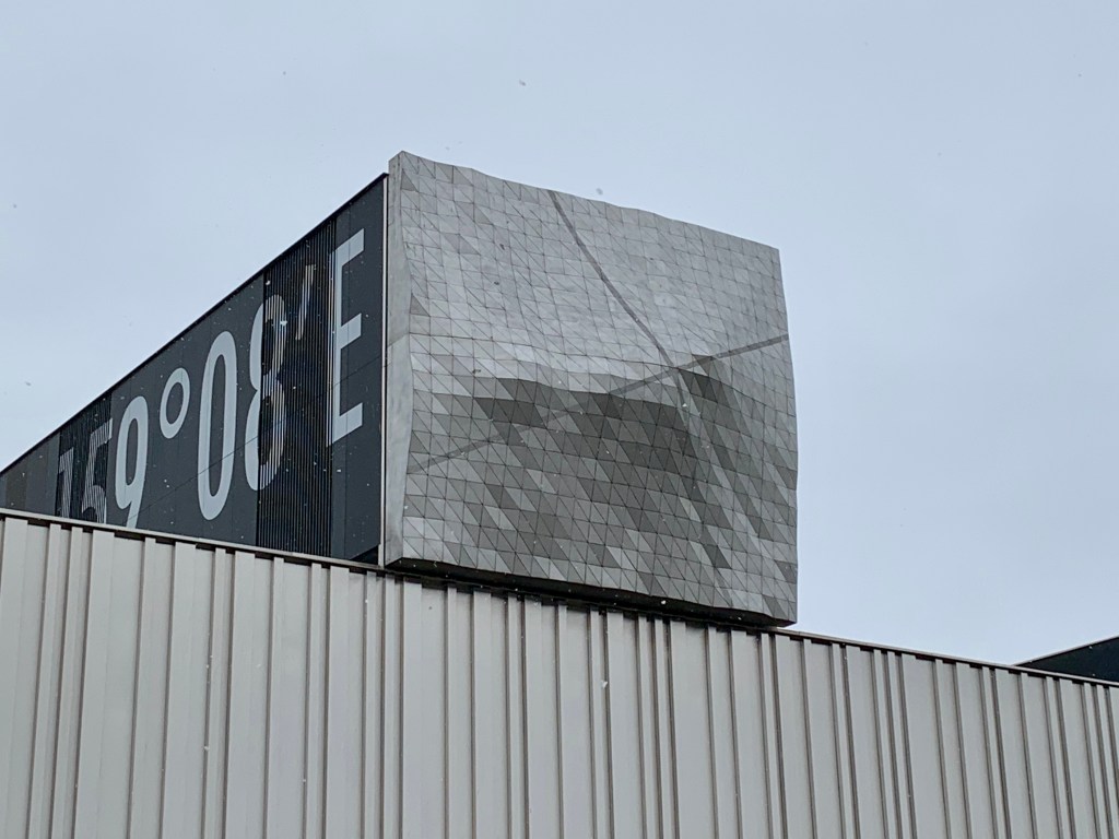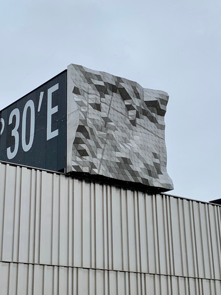 On the roof of the Edmonton Transit System’s new Kathleen Andrews Transit Garage are five art works by Thorsten Goldberg at the ends of five rectangular cuboids. They are fascinating because they look different each time you look at them, depending on where you stand.
