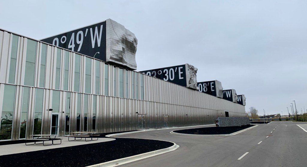 Motorists see them as they drive on Fort Road to and from the overpass at the Yellowhead Highway. The best view from the southwest is at the top of the overpass. When driving from the northeast, though, you get a better view of the geographic coordinates that are printed on the sides of the cuboids.
