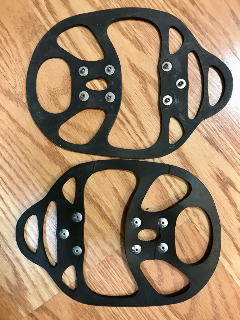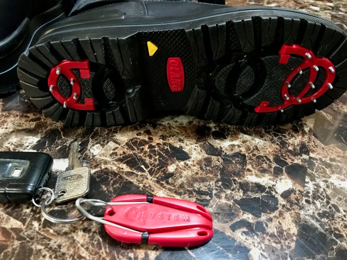 In the past I have tried using cleats in stretchy rubber shoe covers. They are less than ideal because they don’t always stay on. In addition, they make an annoying sound when they hit the pavement; if you can imagine me tap dancing, that’s what it sounds like. As a consequence, I have been reluctant to use them again.