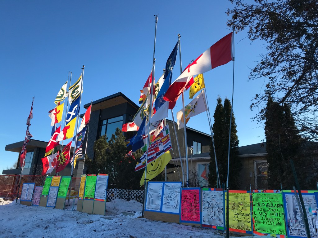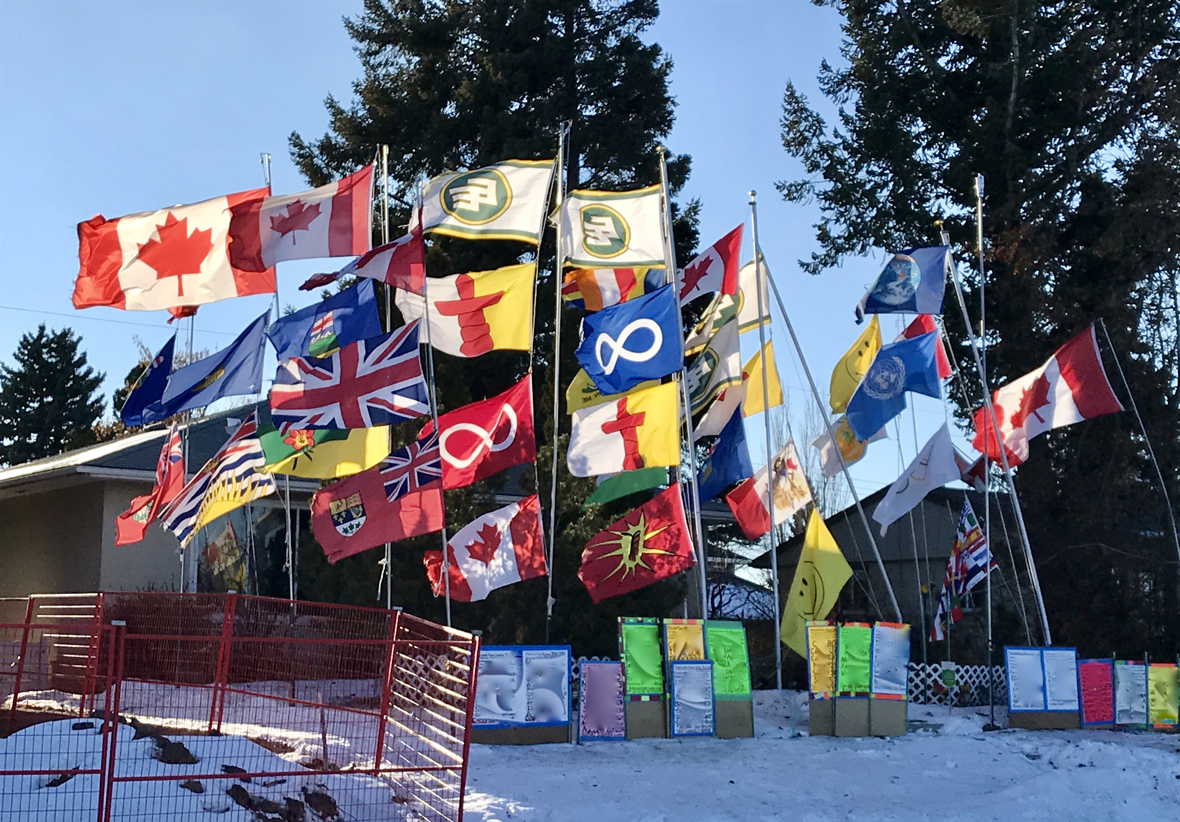 Someone in Strathearn neighbourhood has filled their front property line with flagpoles, flags, and hand-written signs. I counted thirty-eight flags and although I cannot identify them all I saw several Canadian national flags, a Union Jack, two Treaty Eight flags, two Edmonton Eskimos flags, and a few different provincial flags. Somehow, the pride we normally associate with flags does not seem to be present here. It just seems like a jumble of miscellaneous affiliations.