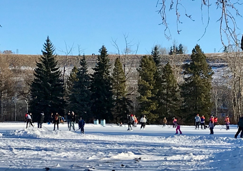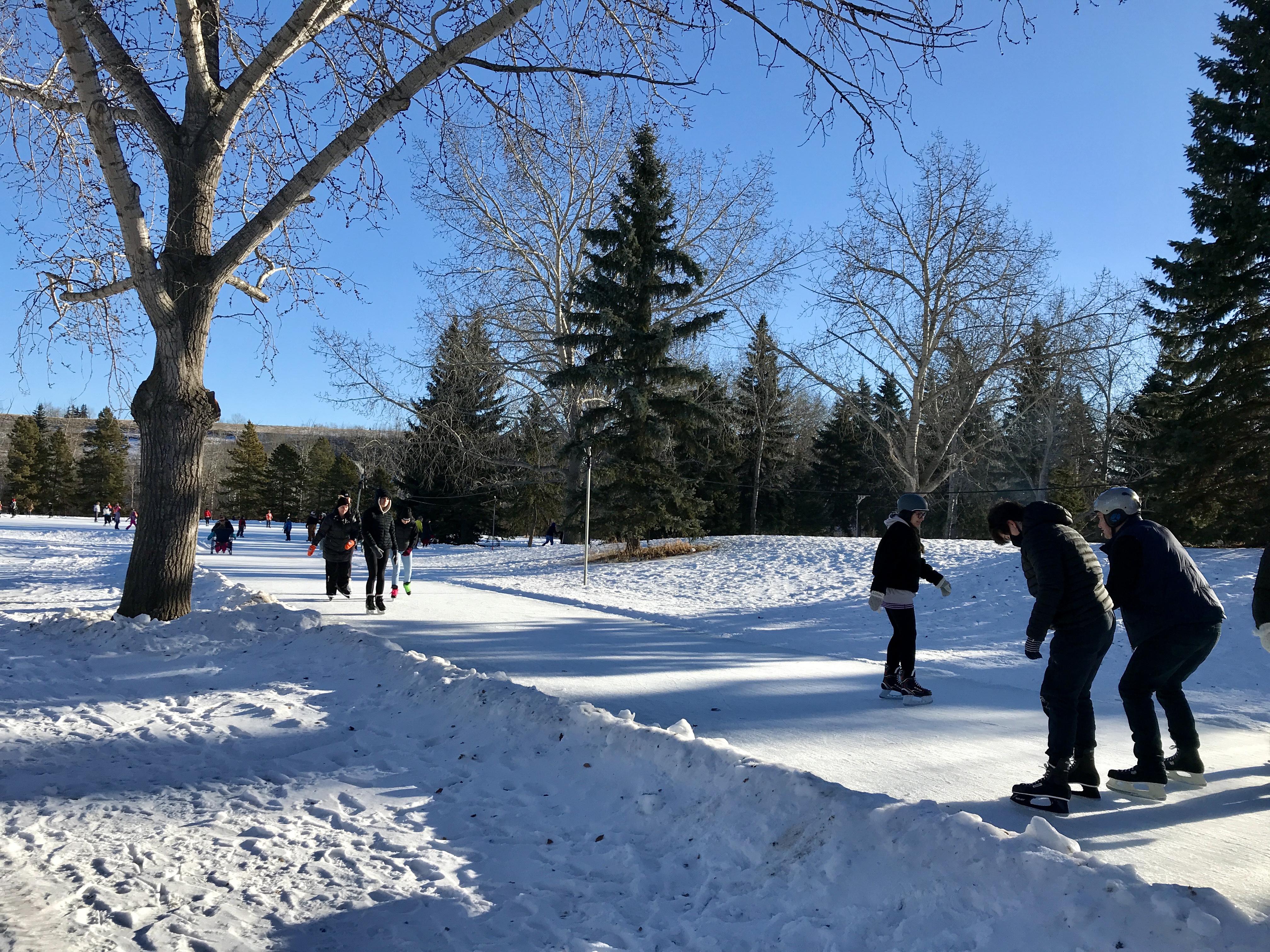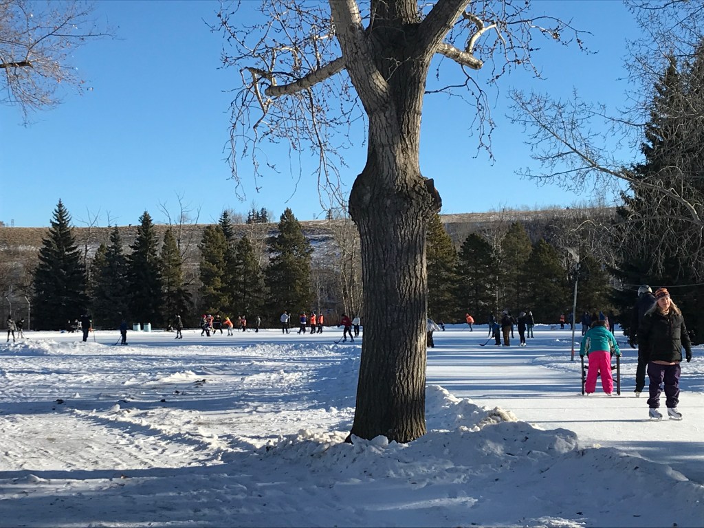 My eldest son introduced me to yet another wonderful park in Edmonton today. Rundle Park is huge and provides lots of amenities for families to enjoy. I was very impressed by the IceWay which is a wide pathway of ice that meanders around trees and alongside picnic sites. It was getting a lot of use by people of all ages and provided skaters an access to the ice rink. No hockey games are allowed right now, but lots of people were out there with hockey sticks, batting pucks around.