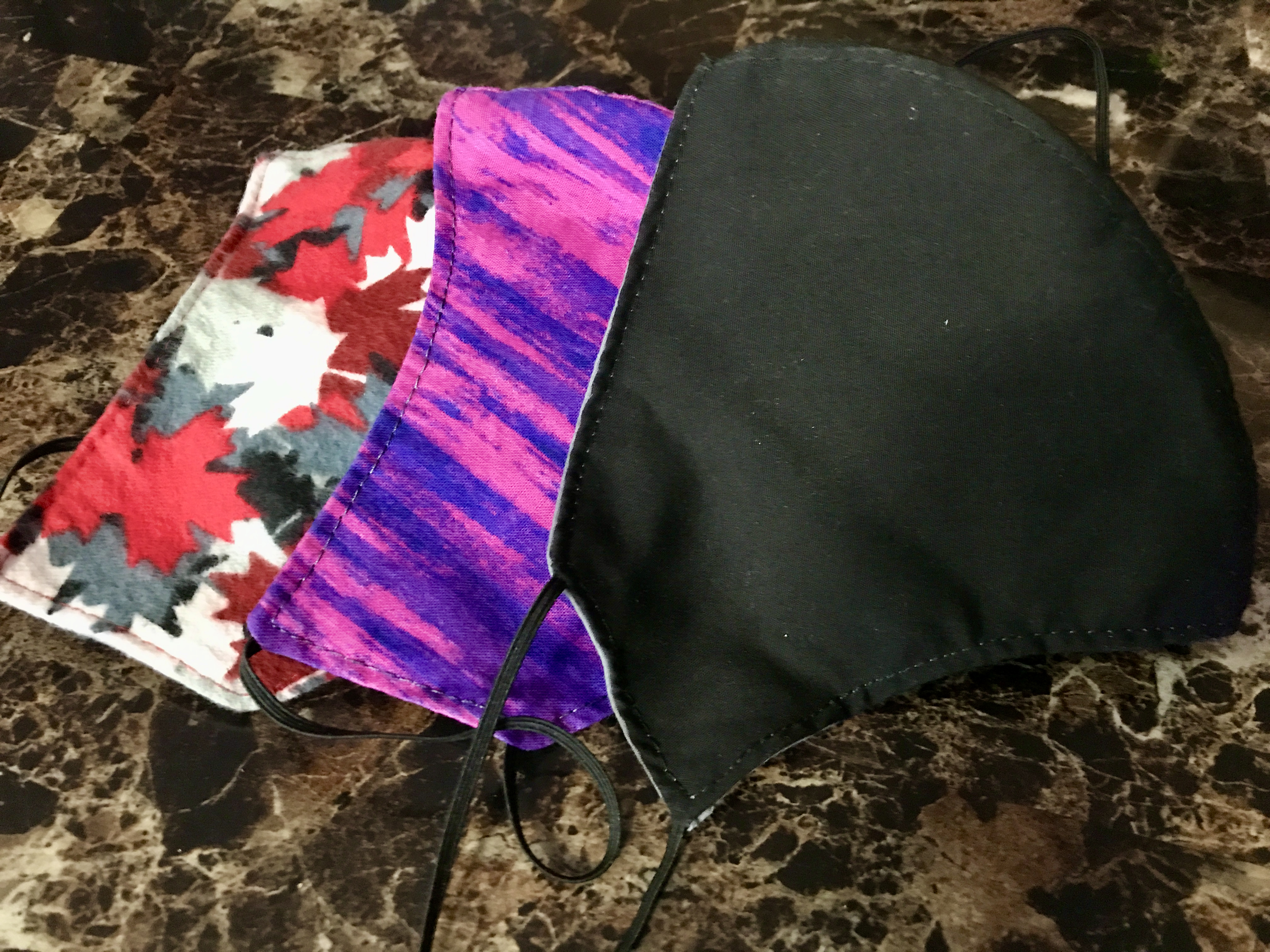 The second masks I bought were made by a local person in Edmonton who caught on to the need and advertised them on NextDoor. These fit well, come in attractive colours, and are easy to wear, but they do not have a metal or foam strip to fit over the nose. As such, they allow escaping breath to fog up my glasses.