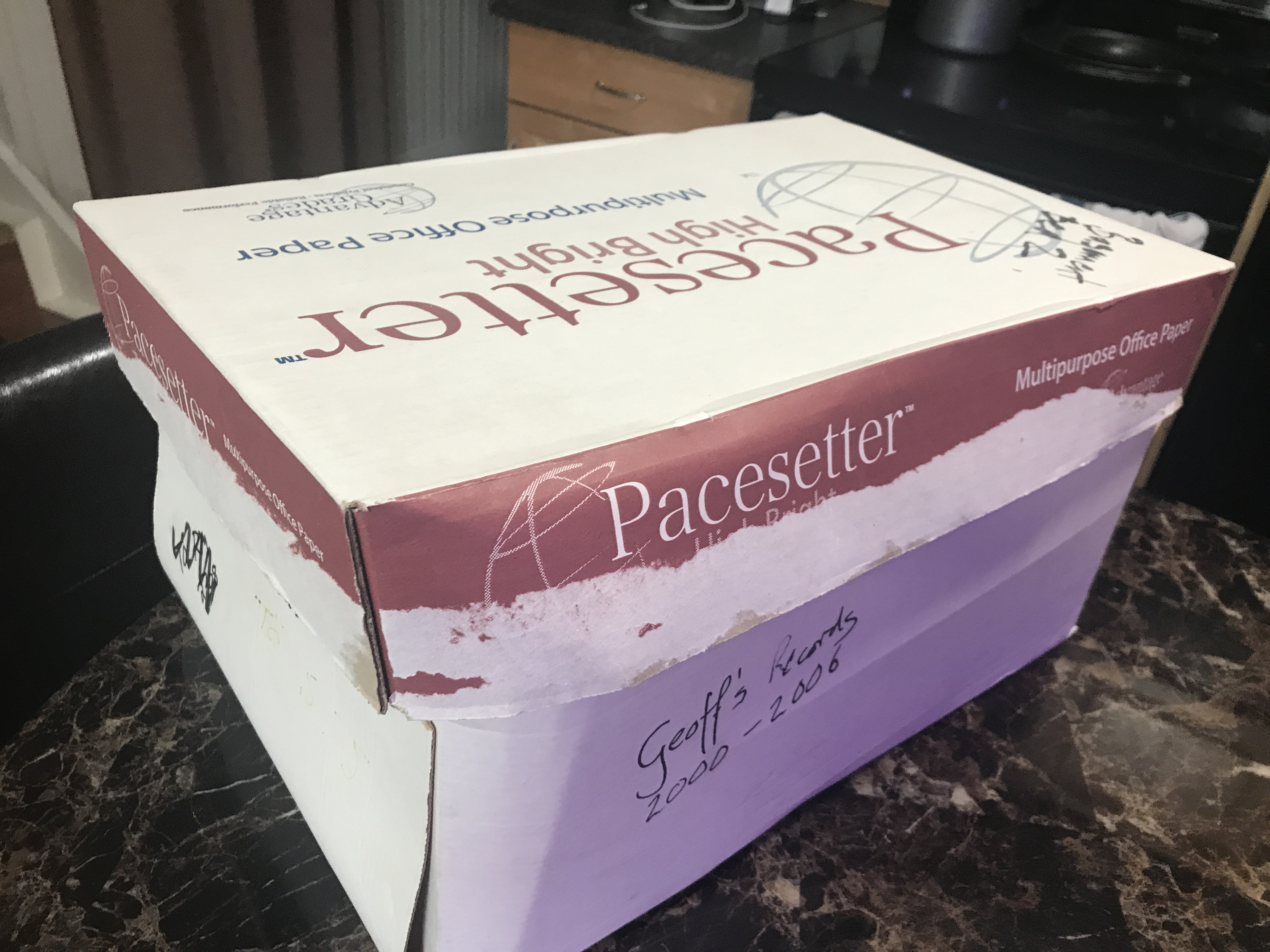 When my eldest son dropped by yesterday, I asked him to take the box from me. I had been looking at it for a few days and gradually building up enough frustration and resentment that I was ready to let it go. I showed him what was in there, and he showed some interest in Geoff’s notebooks. Otherwise, he just looked surprised at the quantity of emails I had saved. Looking at his face and the casual way that he flipped through the pages, I realized how redundant it all was.