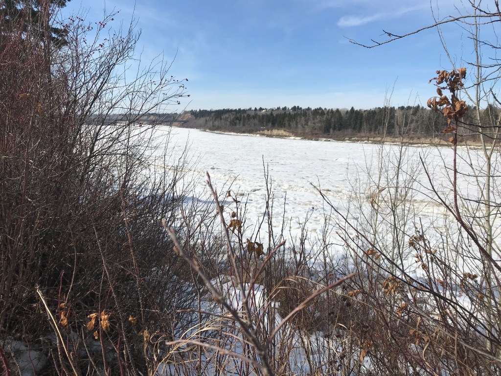 Suddenly today the temperature went up to 14C and nearly all the snow disappeared within a few hours. The sun was shining and the sky was blue as my eldest son and I went for a walk in Whitemud Park in Edmonton. The river still has a frozen surface, but everywhere else we saw bare grass and big puddles.