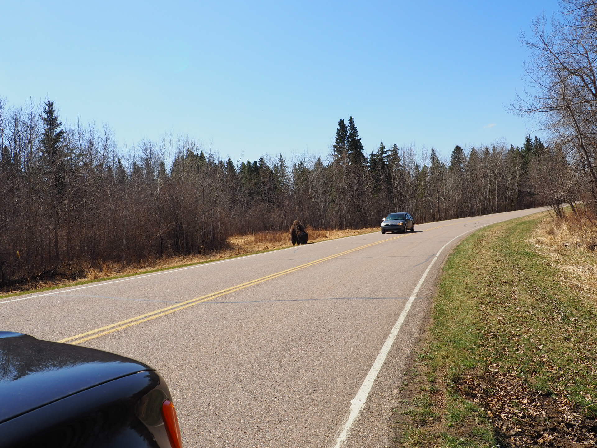 Shortly after we left that area we passed a bison at the side of the road. Like the other bison we saw, it is shedding its winter coat. It was so close I could have reached out to touch it. On our return journey, it was still happily chomping away at the grass, completely oblivious to traffic.