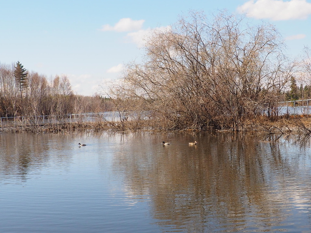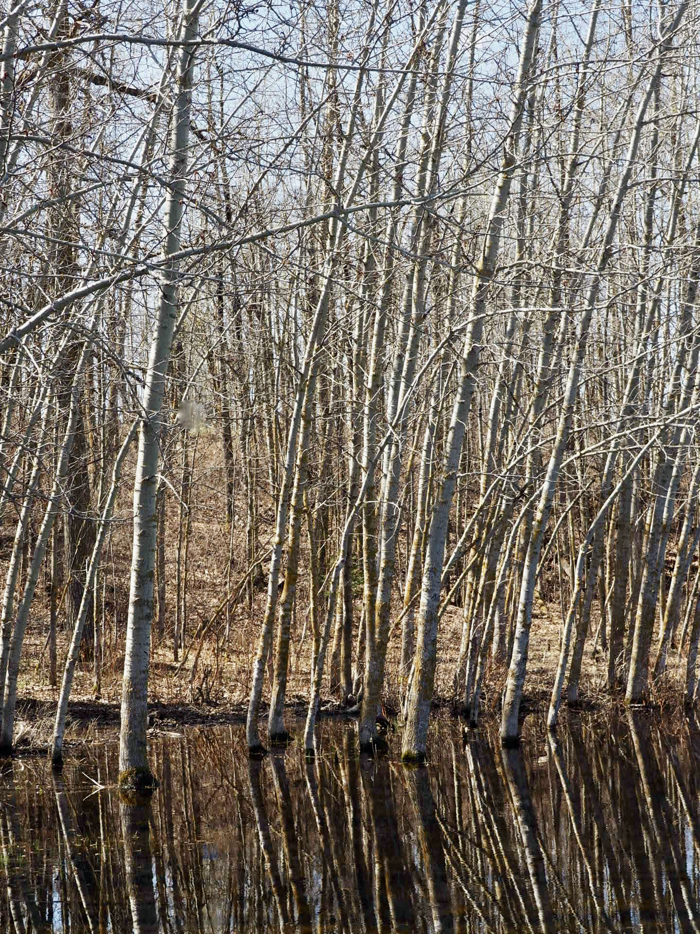 In early May in central Alberta we are just beginning to see signs of spring. There are tiny green buds on the birch trees and when the sun shines on them they have a subtle green glow. The signs of beaver activity are everywhere. They have felled a lot of trees that lie near the dams, just waiting to be needed.