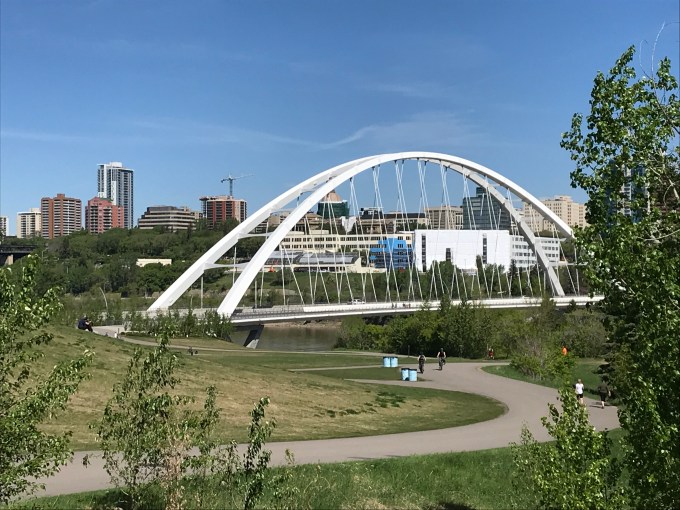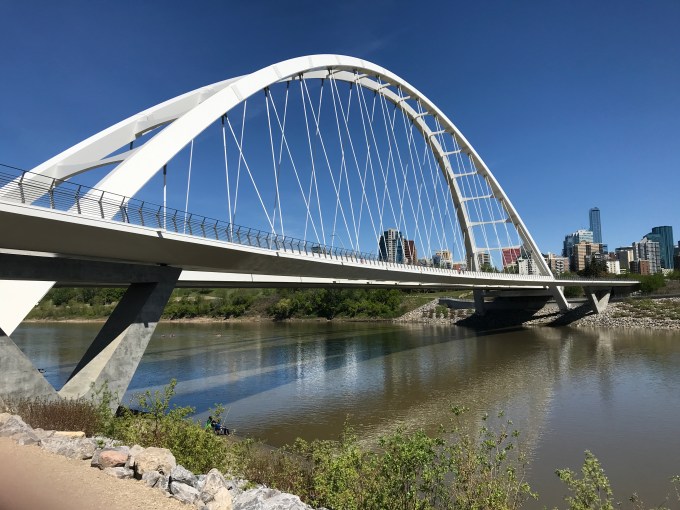 Google Maps thinks this bridge is called the Walter Dale Bridge, but they are wrong. It is named after the nearby neighbourhood called Walterdale and it, in turn, is named after John Walter who was among the early settlers here. He operated a ferry across the North Saskatchewan River at this location.