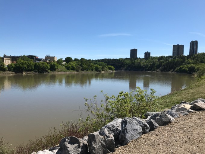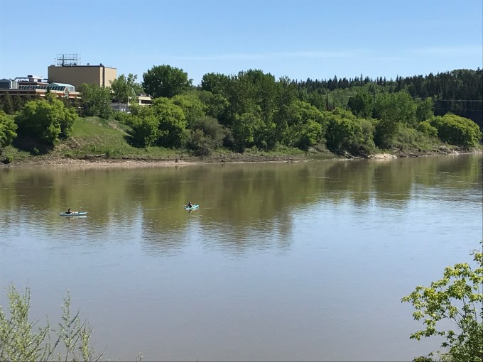 Beside the bridge on the south side of the river are two parks; to the west is the Kinsmen Sports Arena and park and to the east is the Queen Elizabeth Park. Both parks were being put to good use today by people using the trails to walk, picnic, fish, kayak, cycle, and ride scooters. There were also families taking pictures of high school graduates in their ceremonial gowns.