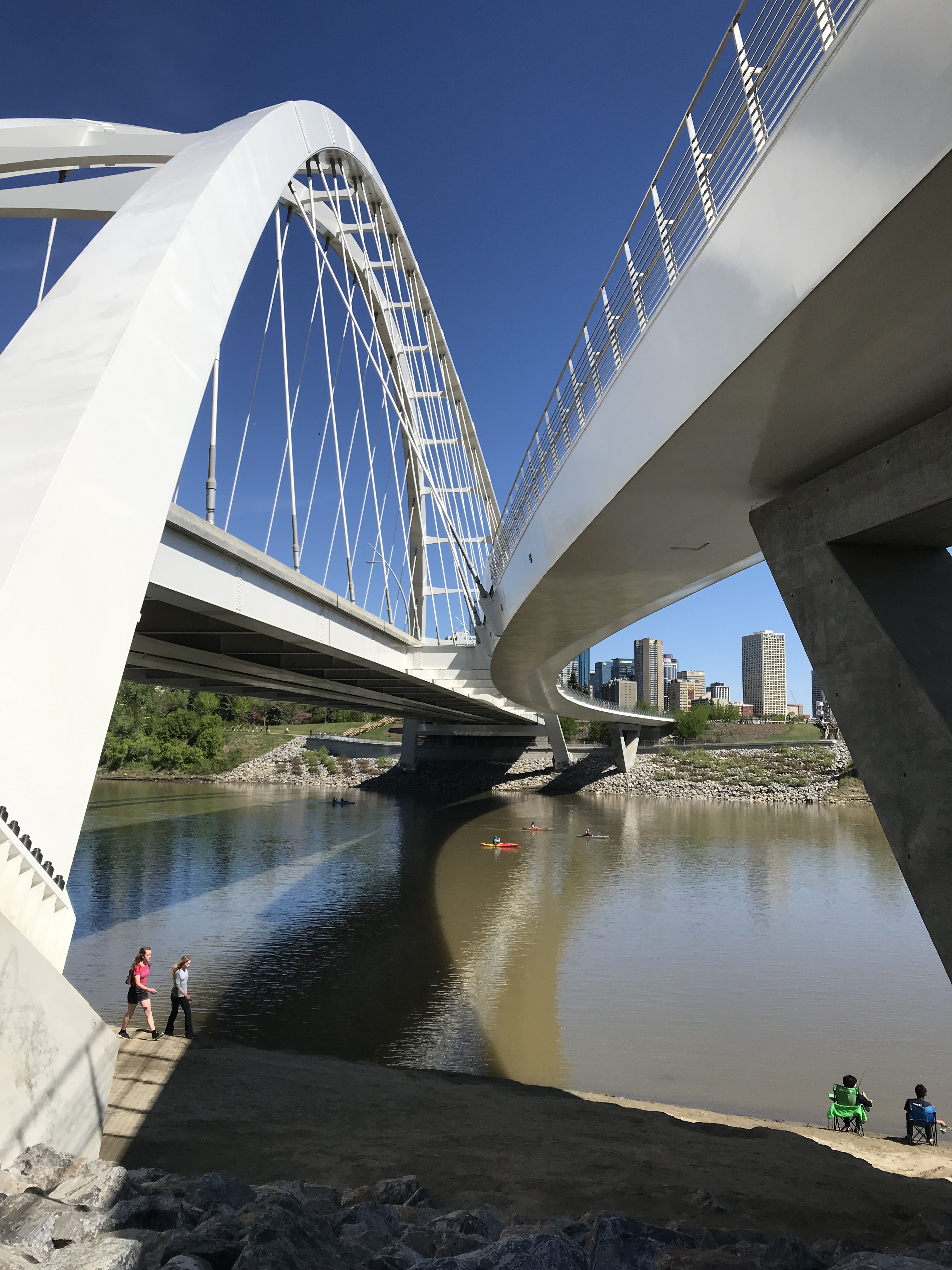 Google Maps thinks this bridge is called the Walter Dale Bridge, but they are wrong. It is named after the nearby neighbourhood called Walterdale and it, in turn, is named after John Walter who was among the early settlers here. He operated a ferry across the North Saskatchewan River at this location.
