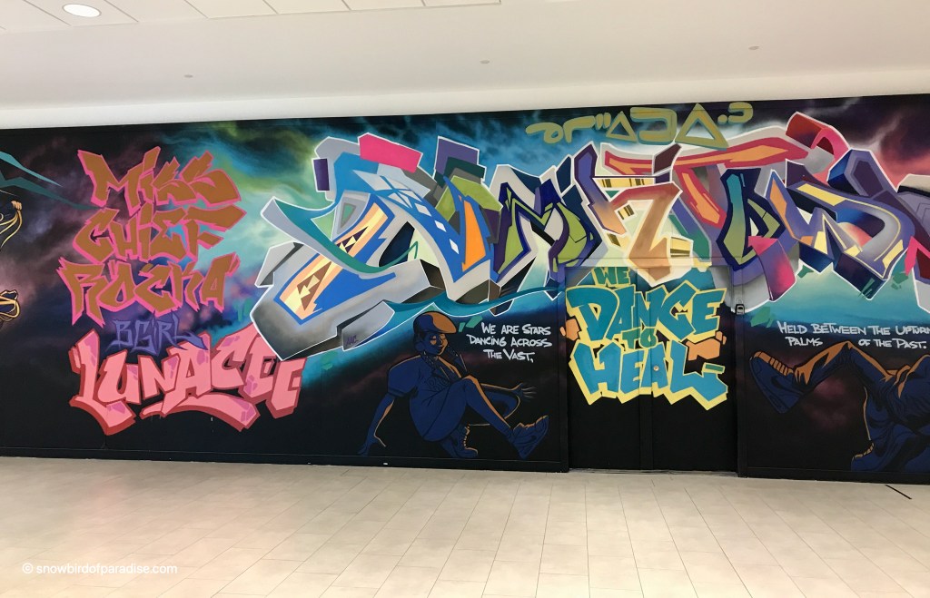 Today I saw some new murals at Kingsway Mall in Edmonton. The first is called Nimihitowin and the artist is Nelson “Dedos” Garcia. The work is a tribute to two Nehiyaw (Cree) artists: iskocês (lunacee) and mitêw kisêynô (creeasian). (Kingsway Mural Project)