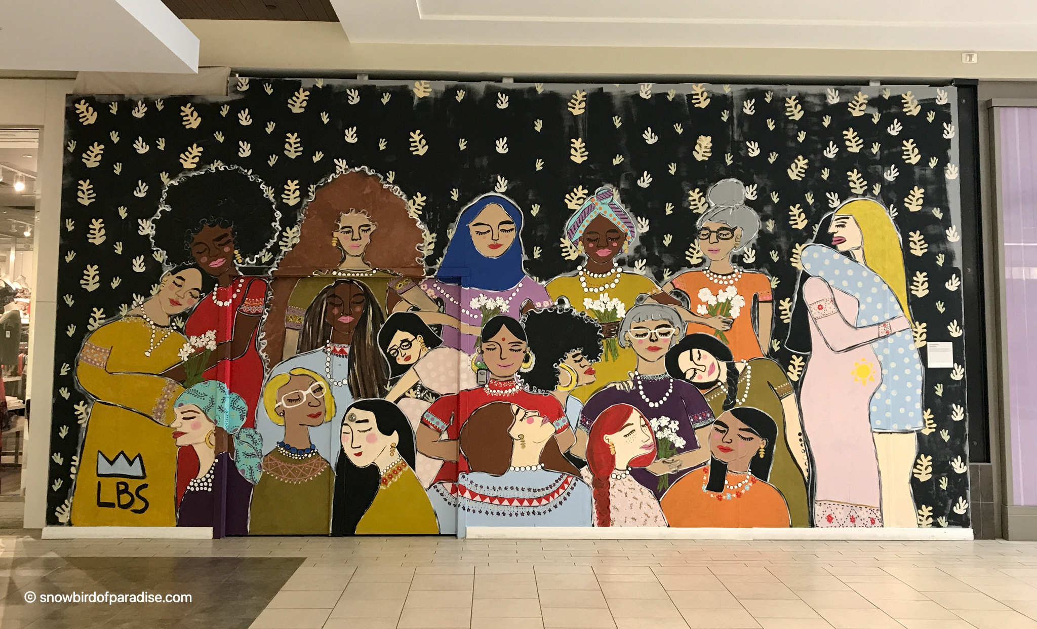 Not far from Nimihitowin is a very different mural entitled Mujeres Divinas by artist Lauren Sanchez. It depicts divine women from various ethnic origins and cultures.