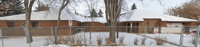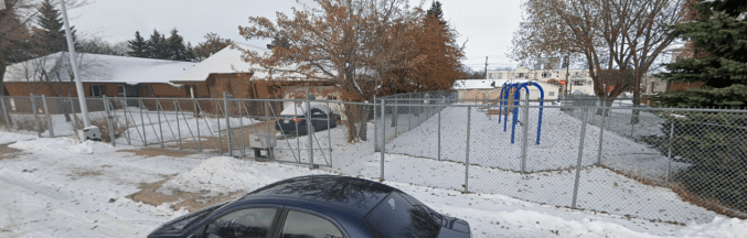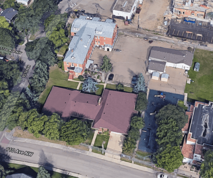 The building with the red roof has a large driveway with a very big sliding gate that limits access. The whole compound is surrounded by a six-foot chain-link fence. In Edmonton, by-laws state that fences in front of residences should be no higher than four feet, but they can be six feet high in the back. It is hard to say which is the front or back here, and equally hard to know if this is considered residential or not. Regardless, the fence goes all the way around.
