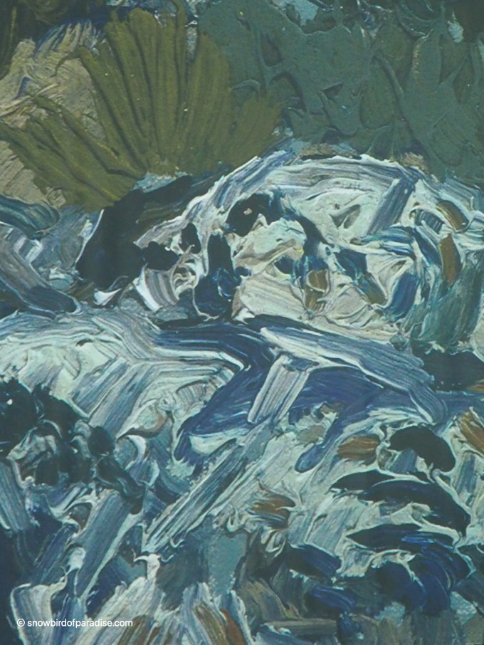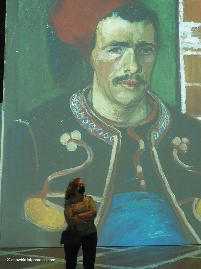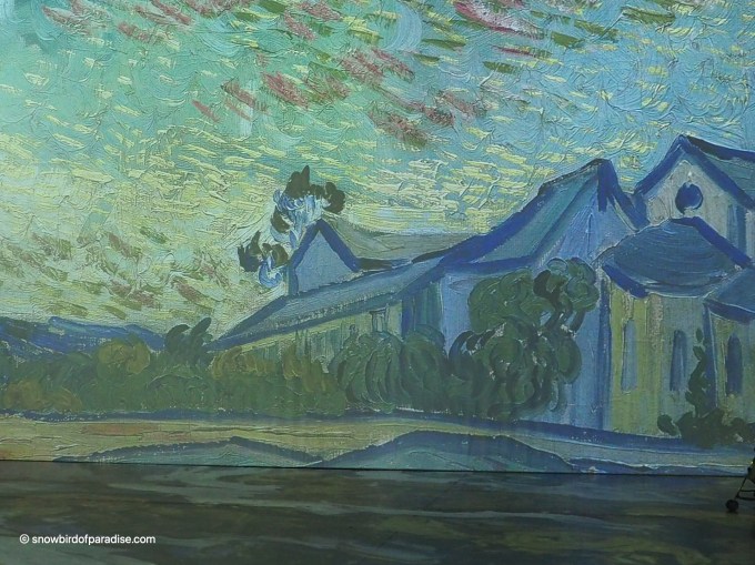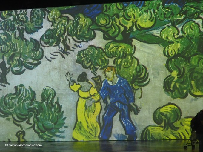 It is an amazing experience to place yourself into a famous painting. Several paintings, actually. The exhibition is a light and sound experience that bathes the viewer in the colours of the art. Even the floor you stand on becomes a part of the paintings. The pictures here don’t do it justice because it is a constantly changing visual and aural experience and photos can only capture brief moments. I thought about taking a video but decided against it because it, too, would fail to show the full effect of the images that are all around the viewers.