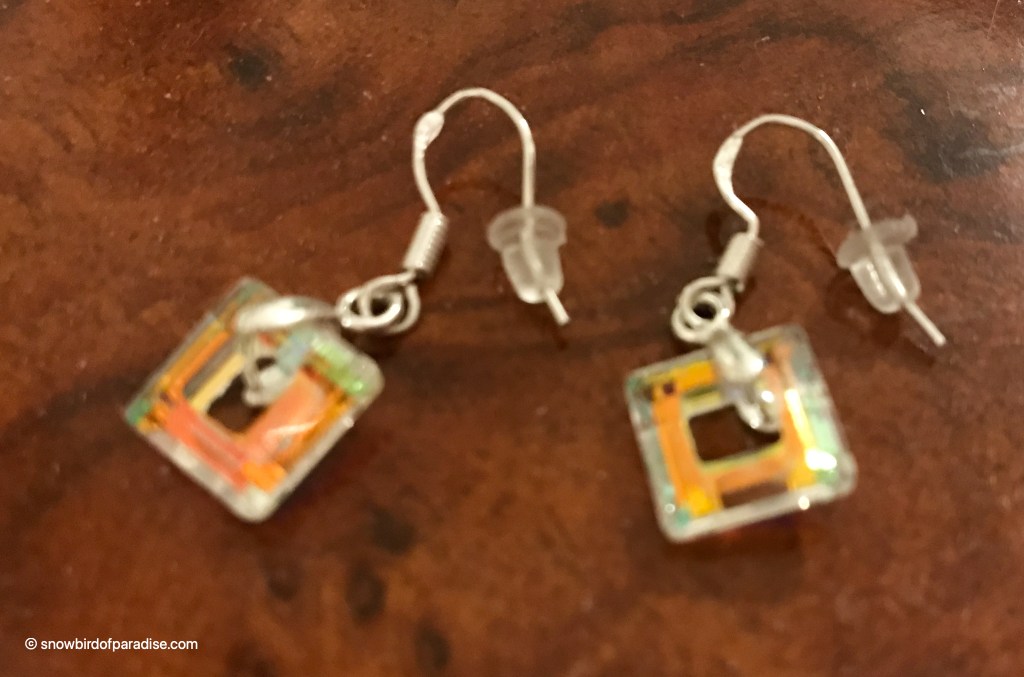 First, I went on a trip to Nanaimo on Vancouver Island in British Columbia. I had a wonderful six days visiting with old friends and checking out the neighbourhood. I have been thinking of moving there and this was a reconnaissance. I looked at condos and apartments and the waterfront and the parks and had a lovely time. The day before I left I bought a few mementos and among them was a pair of earrings. I bought them from a couple selling jewellery on the sea walk, and they were as lovely as the earrings.