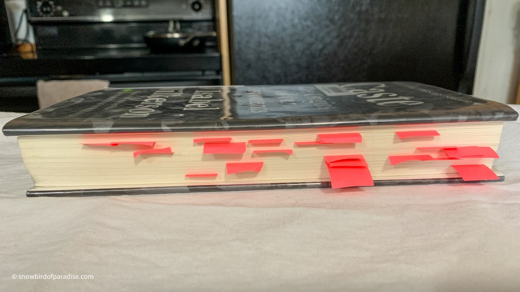 From the very beginning, I was fascinated by Wilkerson’s framing of the problems, and the more I read, the more I found to be enlightening. Each time I read something that was unusually informative, exquisitely phrased, or perfectly concise, I attached a sticky note tab. My library book is now adorned with lots and lots of pink sticky tabs.