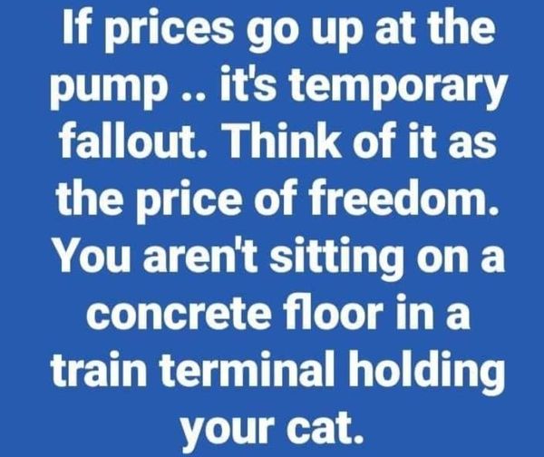 Recently, I posted this humorous image that was intended to draw attention to our dismay at rising gasoline prices. I thought it might raise a smile or two, resonate with some folks, and/or draw attention to the frustration of it all. Subsequently on my message feed were some memes indicating that it was inappropriate to worry about gas prices when we should be more concerned about the war in Ukraine.