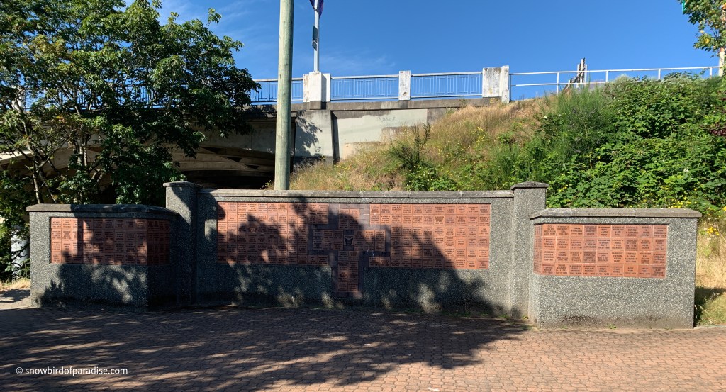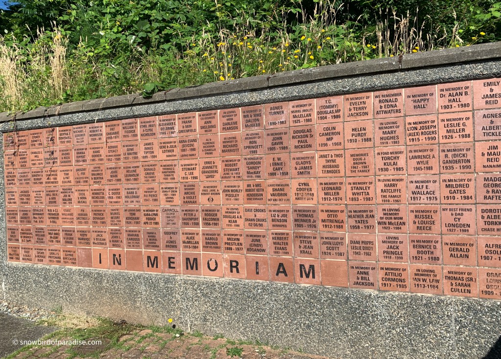 For those who are curious, it seems as though some of the bricks are in memory of departed loved ones, and similar bricks bear the names of local businesses and individuals that funded the project. There is nothing to indicate which is which, but I’m guessing that Save On Gas and MacMillan Bloedel Ltd are still with us.