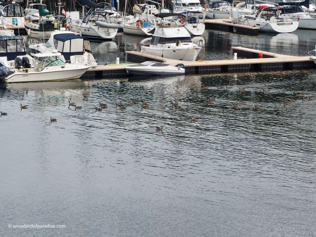 I heard the gaggle of Canada Geese before I saw them. A goose’s call is very distinctive, and when there are many of them is it impossible to ignore. I saw the splashes as they landed in the channel beside the marina and then I watched as they paddled towards the shore between the docked yachts.