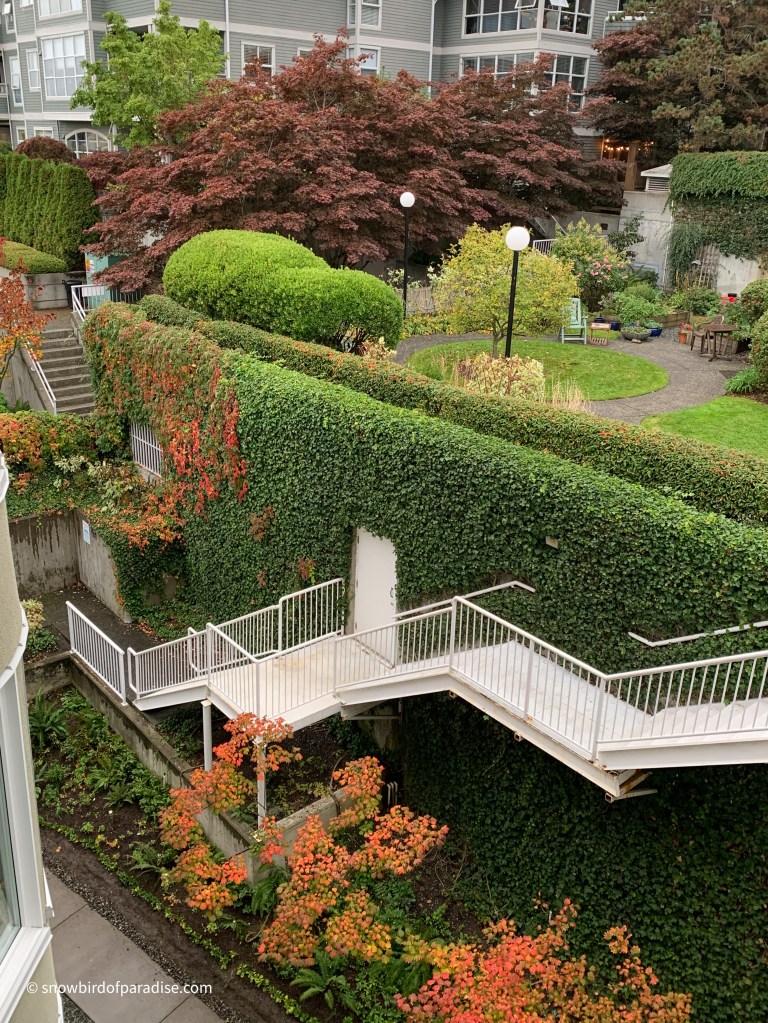 Quite a delightful view; with the angles of the stairs and buildings and the rounded softness, textures and colors of nature’s contribution.