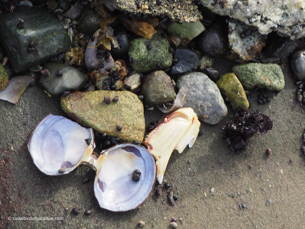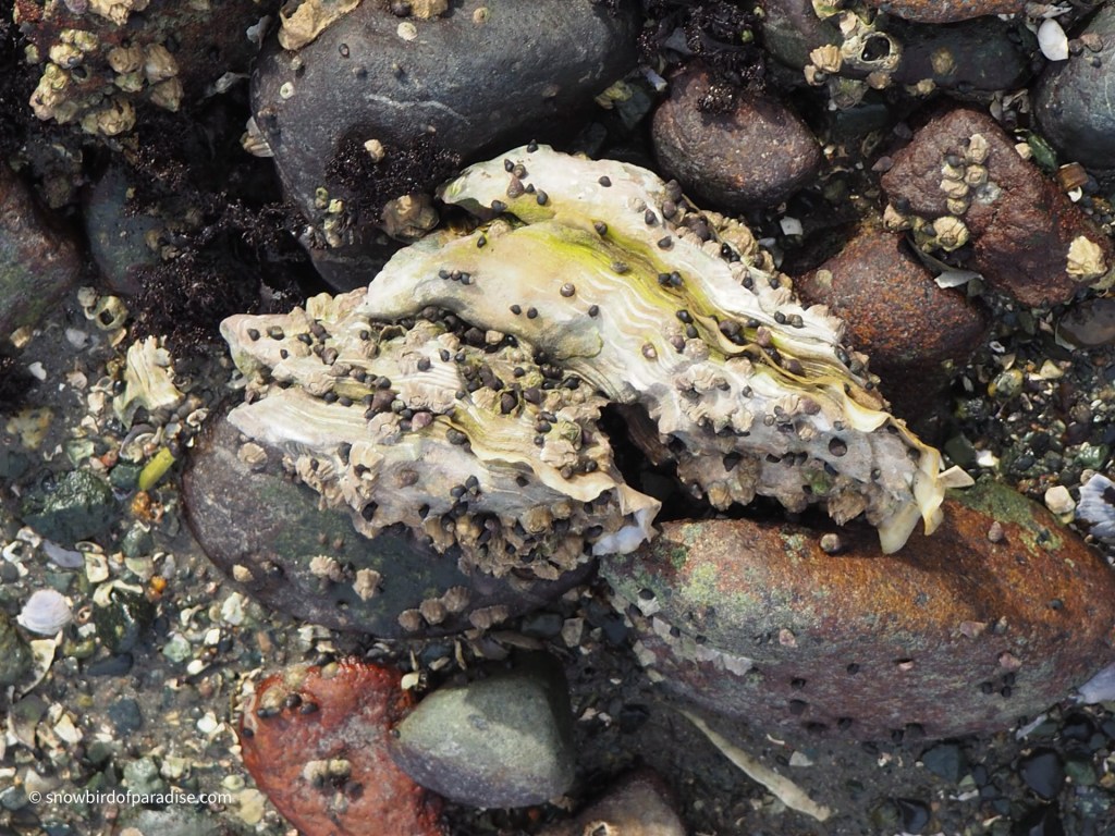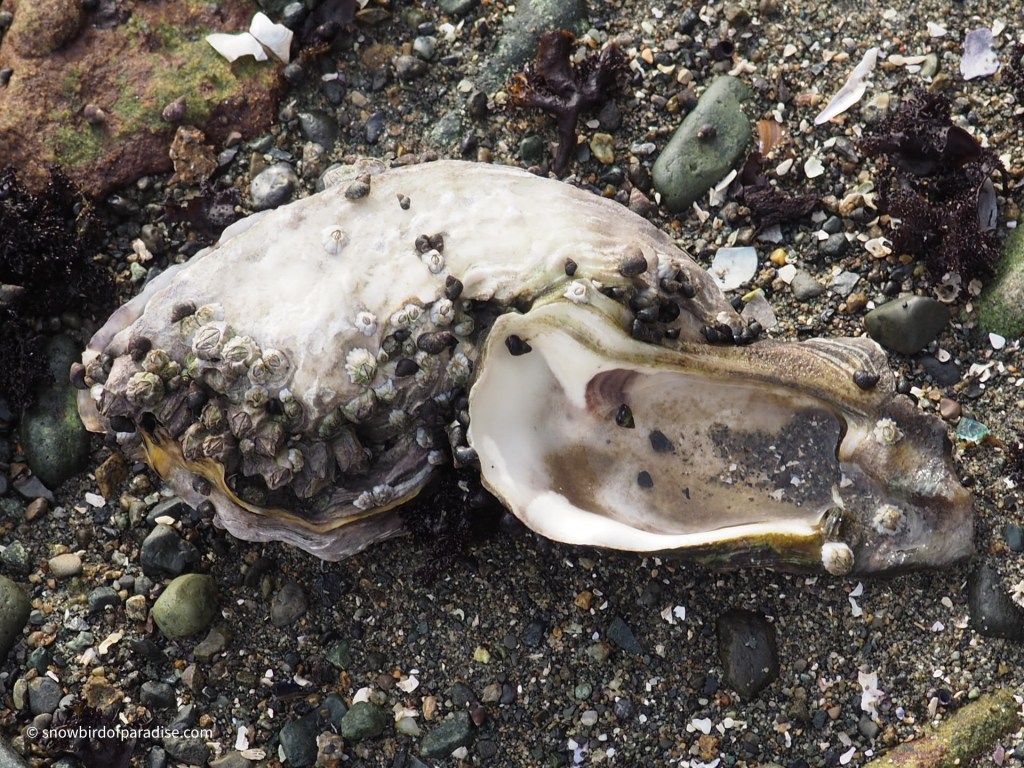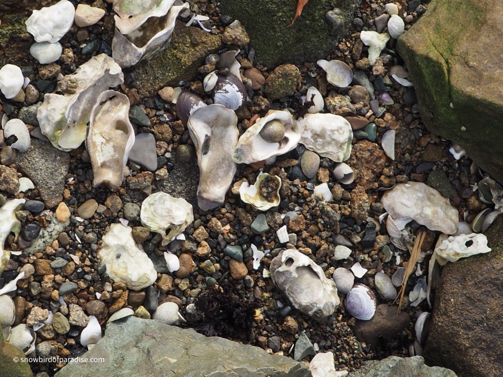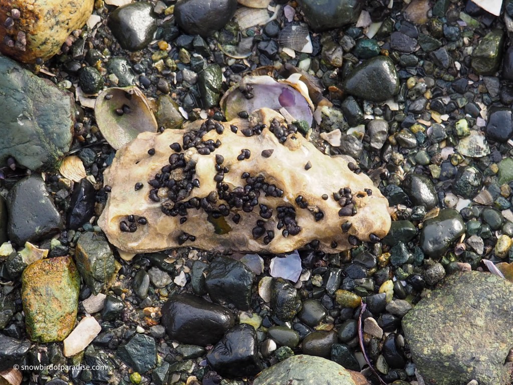 All along the beach at Nanaimo are the broken shells of shellfish. The gulls and other shorebirds have figured out that the rocks are a great place to smash open these little calcium carbonate structures in order to feed on the inhabitants
