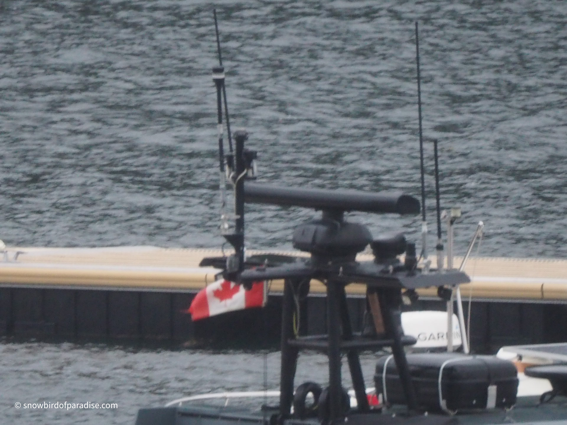 That makes sense. So, why am I looking at a grey boat? When I looked online for information, I discovered that US naval vessels are usually grey and that this marine enamel paint is called Haze Gray. In WWII there was an expression “Haze Gray and Underway.” If this boat was once a US Navy vessel, it is no longer American as it is flying the Canadian flag.