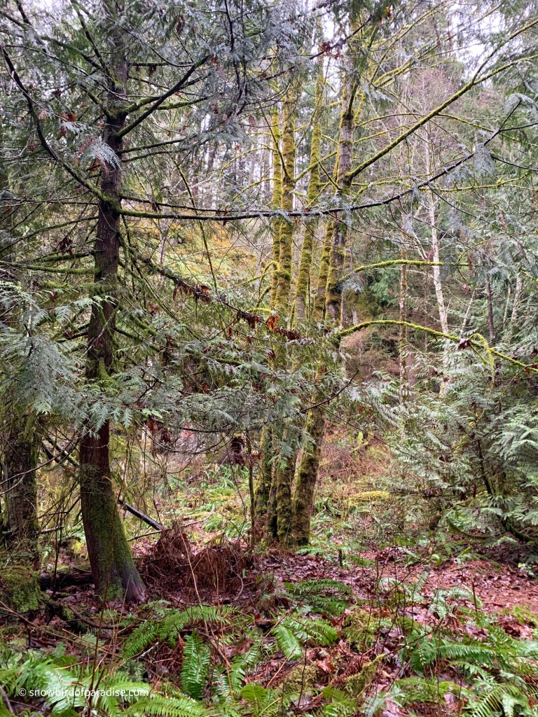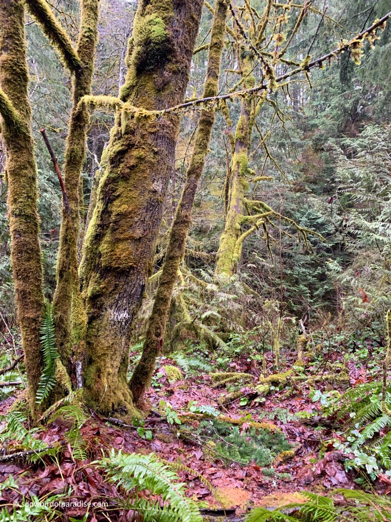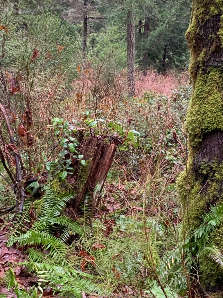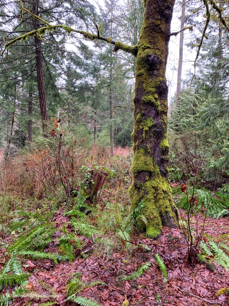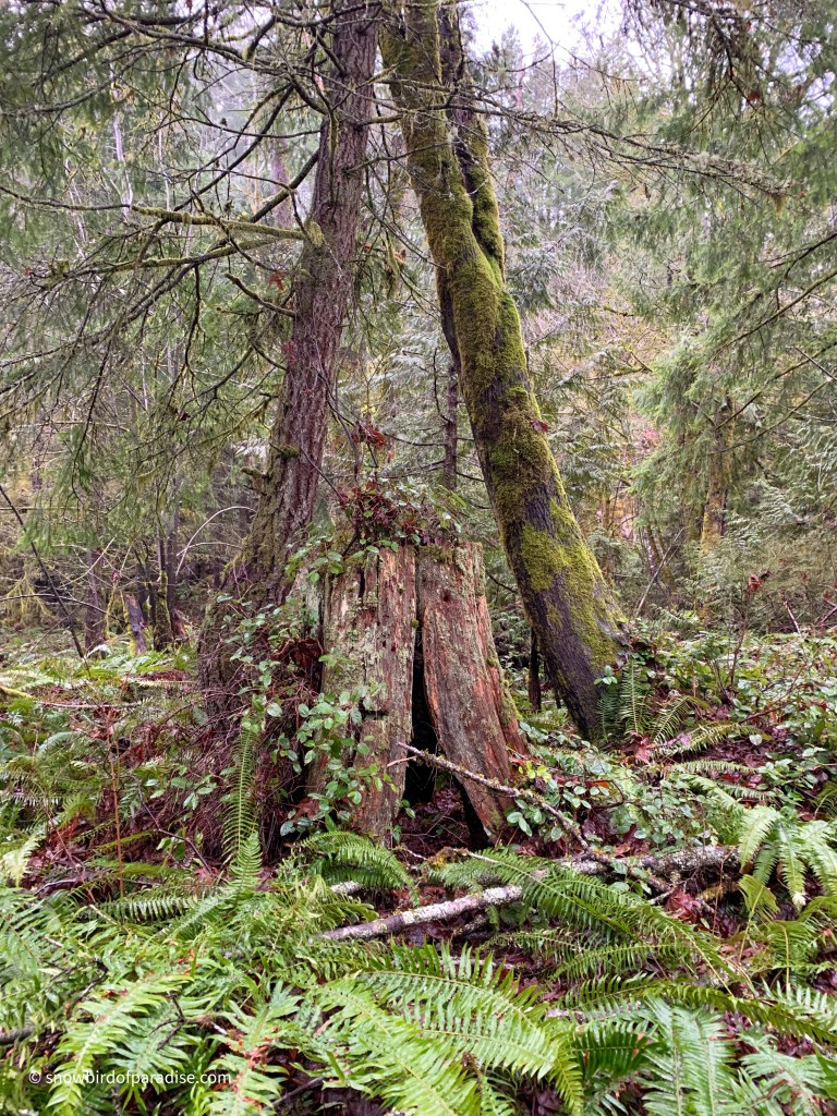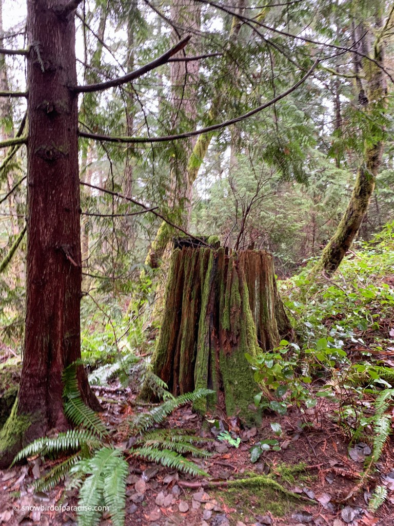 The trees were resplendent in their coatings of lichens and moss, and I also enjoyed seeing several nurse stumps. Nurse stumps are mother nature’s use of the remains of logged trees to nurture new growth. As seeds fall from the trees above, the decaying stumps provide fertile ground for the seeds to take root.