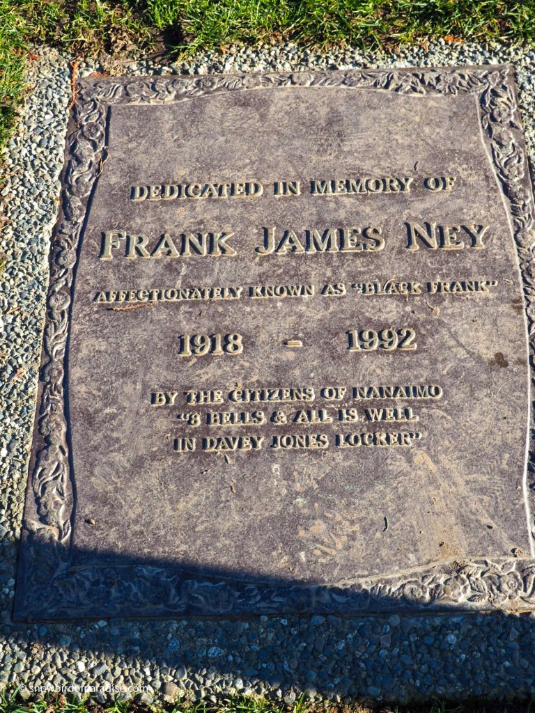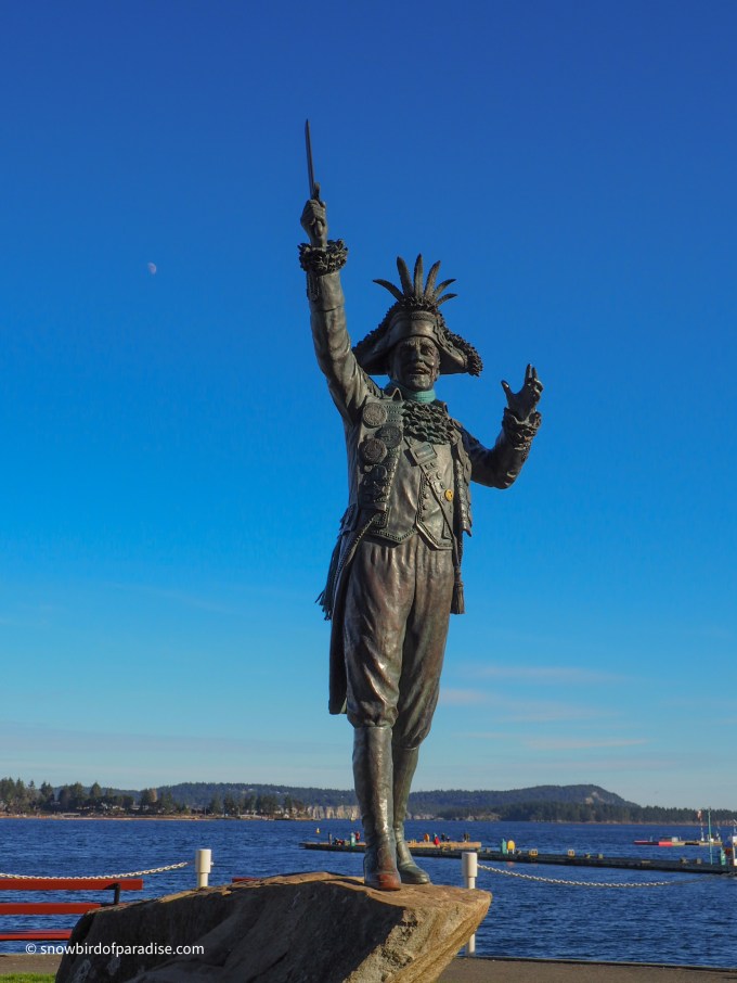 “Black Frank” was the pirate persona adopted by Frank James Ney, a former mayor of Nanaimo. A statue in his honour is in a prominent location by the sea wall at Swy-a-Lana Lagoon. When I took these pictures I noticed that someone had given him a scarf to keep warm and a yellow smiley face button just for fun. He would have liked that, I think.